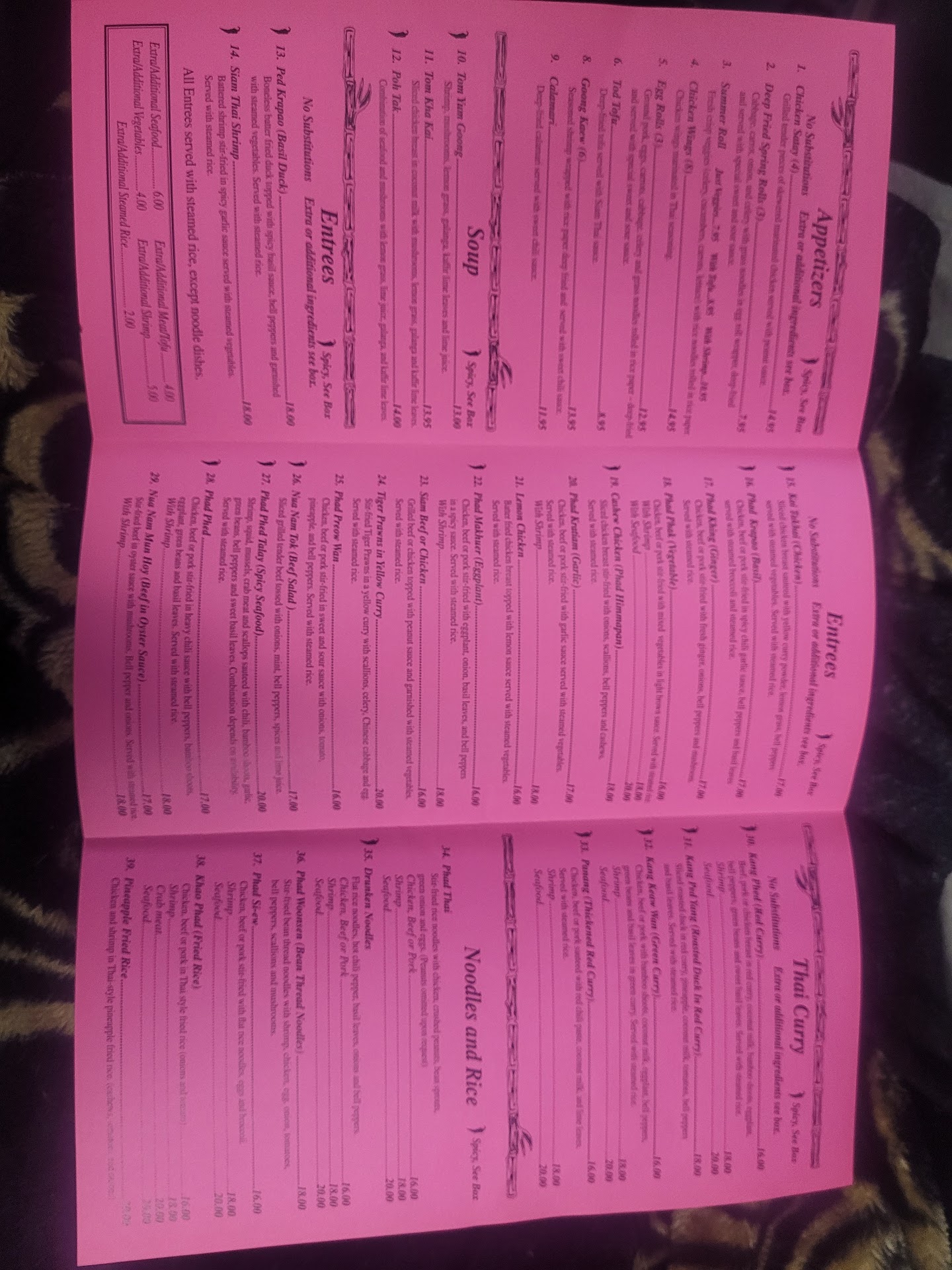 #1) ORDER A VARIETY. If you walk in and order one entree at Siam, you are cheating yourself. Take your family. Get at least FIVE different things to share. Leftovers are great! (see Reason C). Here are my favorite things to order at Siam, IN order, and in the words I use to order them, because at this point I don't look at the menu often: Phad Thai (w/ tofu & extra sauce see Tip#2), 2. Drunken Noodles (w/beef & extra spicy (CAUTION this is spicy, get it?)), 3. Basil Beef, 4. Massaman Curry, 5. Summer Rolls (w/tofu or shrimp), 6. Tom Kha Kai soup, 7. Poh Tak soup.