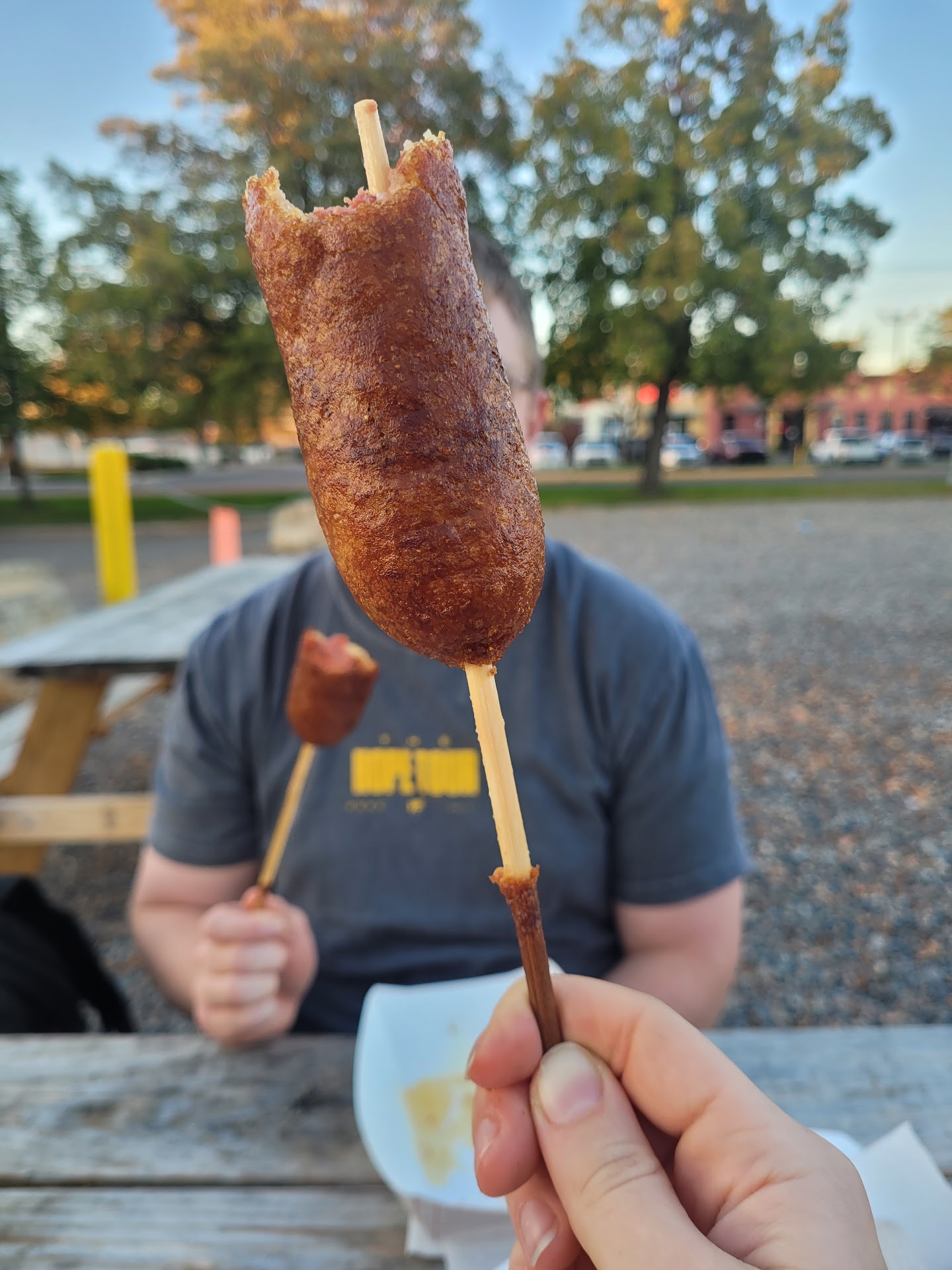 Read moreCrispy, Warm, and Delicious. We went on a Monday night at 6 and it was not busy at all. Fun atmosphere and delicious food. We both got the epic corn dog ($8 each) and they were so good. They didn't take too long. There's picnic tables in the area and it was peaceful. Had a...