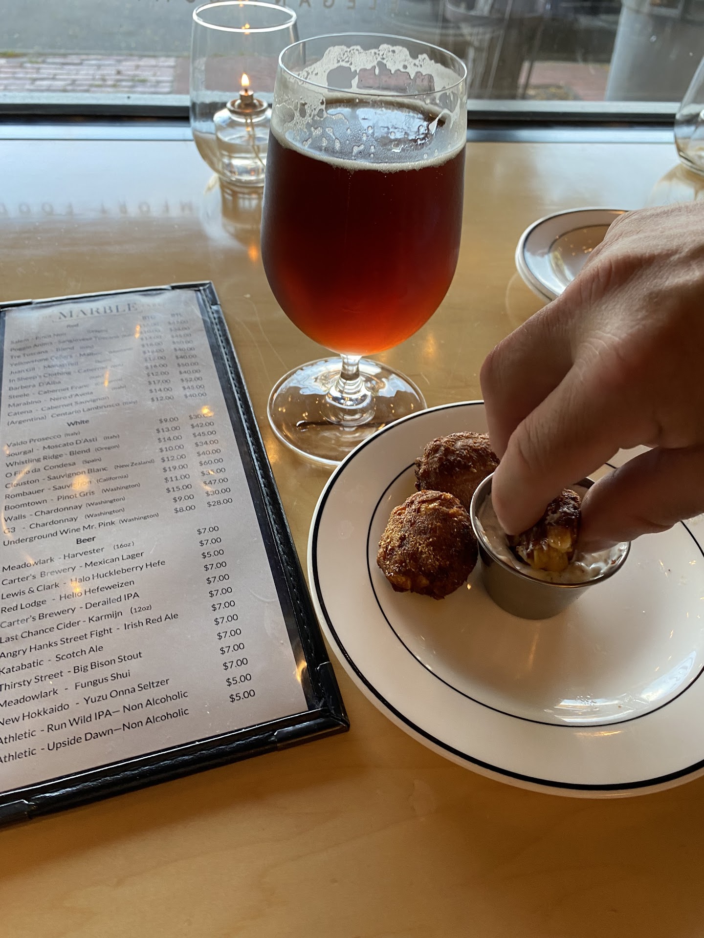 Our server was very friendly. He started off by taking our drink orders. My go to is iced tea with a splash of lemonade (an Arnold Palmer is usually too sweet for me). My wife (MW) asked about mocktails, nope, so she copied my drink choice. First mistake, even with the splash the tea was very astringent. Then came the listing of the specials. I remember the price of two out of three. Mainly because I had to keep my jaw from hitting the table. Two steak options, one of which was 75 dollars, not aged, not served with Truffles, 75. The other one while still pricy was not memorable. Then the fish special...Halibut filet with accompanying sides etc. 64 dollars. I'm confused now. Their entrees range from $20 (mac n cheese) to $42 (pork chop). On to our food. We ordered the smoked whitefish dip appetizer. More on that later. MW ordered the fried chicken $28 (see menu for description). Now MW doesn't do spicy, so asked for the chipotle maple syrup on the side which they did. I tried it, and yes it has a bit of a kick, so she asked if they had regular syrup (they don't). I donāt know if the candied cottage bacon was part of the sauce and sank to the bottom of the sauce cup or if they just didn't bother. The chicken was good (maybe, maybe two thighs) was chopped into nuggets and fried. The cornmeal pancake was good. The side of green beans looked and tasted like they came out of a can got warmed up in a pot with some spices and dumped into a bowl. I ordered the lamb meatloaf $32. (Again, see menu for description). Two meatloaf sticks 1"x1"x4" is the best description for them. While tasty, they felt a little small on top of a huge lump of mashed potatoes. The "creamed spinach" was some spinach wilted in a pan with some cream maybe. This was on top of the potatoes and under the meat. The pickled veg was red cabbage that maybe sat in vinegar for an hour at best. The mushroom gravy was unremarkable. Now lets talk appetizer. It's after the mains because when our server brought the entrees and asked if there was anything else MW pointed out that we hadn't gotten the app. He was apologetic and brought it to the table shortly after we started eating. This was less of a dip and more of a sauce. The taste was similar to tzatziki but very dill and caper forward. It did have a little smoked fish flavor and there was one small chunk of fish found swimming in the sauce. Served with naan that was very similar to what I've gotten at Costco. The desert (comped because of MW birthday) was the London Fog creme brule. While good, the london fog didn't come through and added an unappealing grey color to the dish (the candle was appreciated).