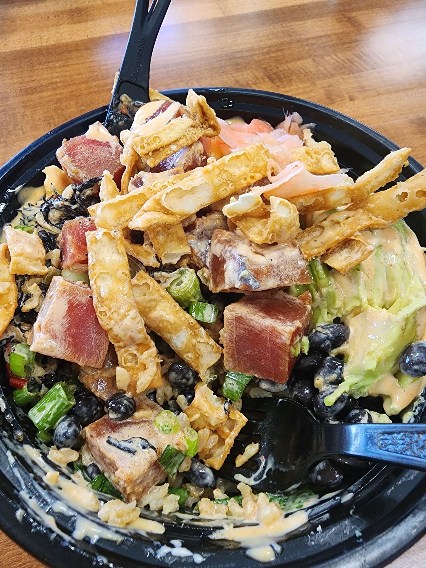 Let's start with food. I ordered a BYO small bowl with: 1/2 white rice, 1/2 sushi rice Edamame, Green Onions, Avocado & Krab Salad 1/2 Hawaiian Poke, 1/2 Spicy Tuna Poke Spicy Mayo Pickled Ginger & Furikake