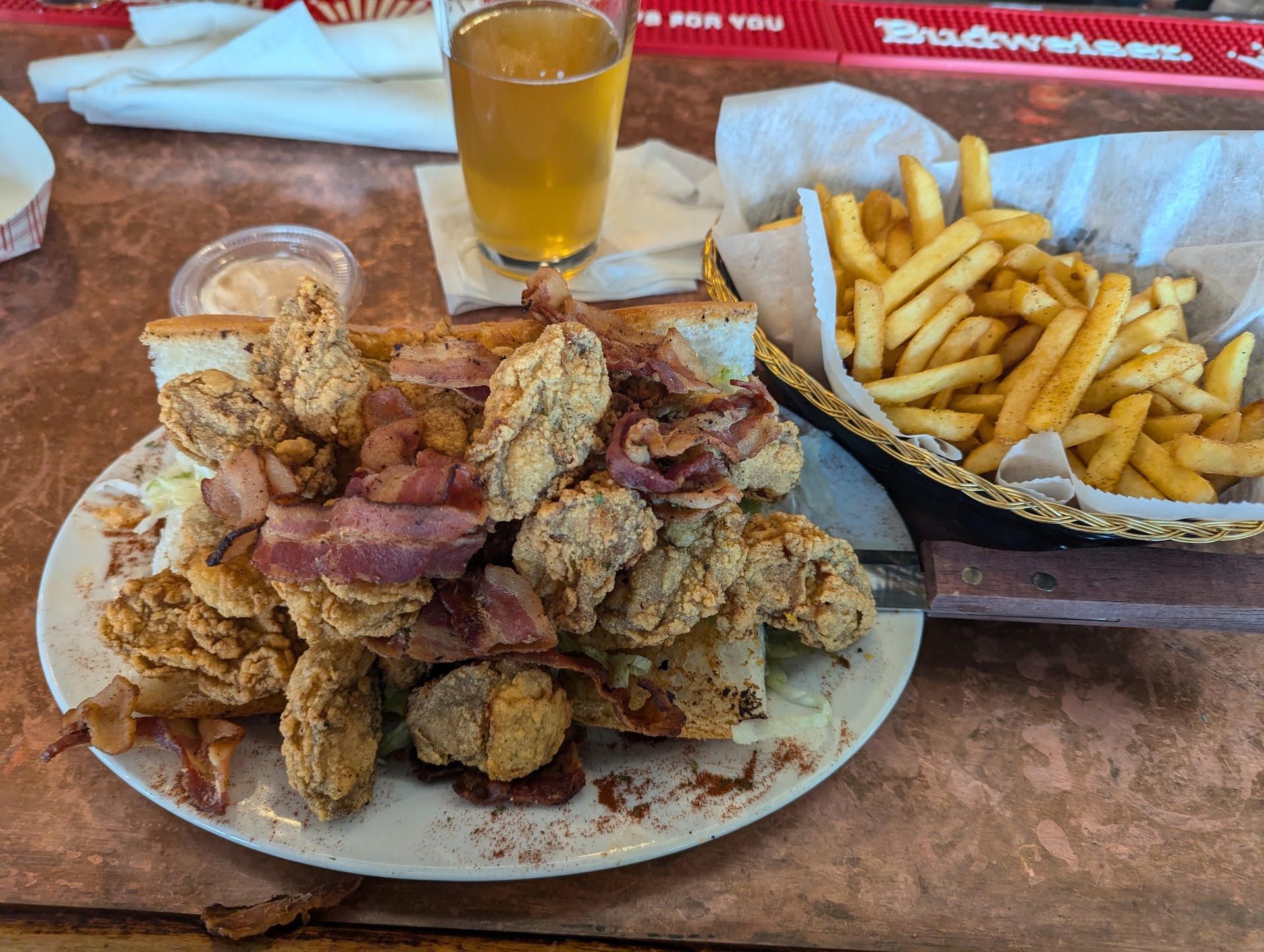 Read moreDefinitely more of a bar than a restaurant. It was quite smoky in there, and our clothes smelled smoky afterwards. Also, the smoke was enough to irritate your lungs if you're a nonsmoker. But, you should expect that at a bar. Ordered pig wings and cheese bites for appetizers. Cheese bites were pretty good. Pig wings tasted fine with ranch, but they were more of a novelty that I wouldn't order again. Ordered Juicy Lucy, oyster po boy, chicken tenders, crab claws app, and chicken cordon bleu wrap for main entrees. The Juicy Lucy wasn't impressive to my wife. She ordered it well done, and all of the cheese exited the middle of the two patties. So, it really didn't taste cheesy at all, and it was fairly greasy. Sweet potato fries for the side were good, though. My daughter got the chicken tenders. The portion was very large, but we noticed that a couple of tenders weren't fully cooked. The waitress comped us the chicken tenders for that mistake, and there were enough cooked ones left. My mother in law's crab claws had a little bit more of a fishy taste than she's used to, so she wasn't as happy with them. Portion size was large for the price though. My father in law's oyster po boy was a bit too large to eat, but he didn't seem to mind the taste. So, b if you get one, you'll want to cut it down first. The fries that came with it were really good though. My chicken cordon bleu wrap was pretty good. Chicken was grilled and fully cooked, ham was smoked, and Swiss cheese was a good mix. Fries were again pretty good. I think overall I was the happiest of the group with my selection. It's not someplace that I would return to, but mostly because of the smoke. The lung irritation was distracting to the dining experience, and there is no place to sit where you're not going to have smoke (two people at the table behind us were smoking as well as about half the restaurant). The photography on the walls is quite striking though. Many of the shots were amazing and lived up to the restaurant's...