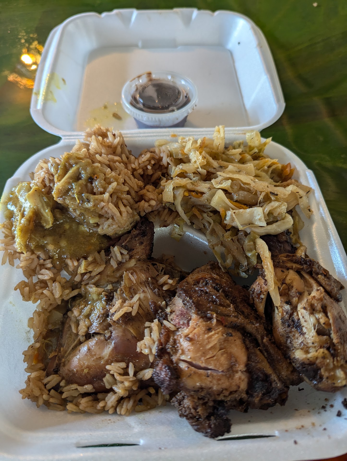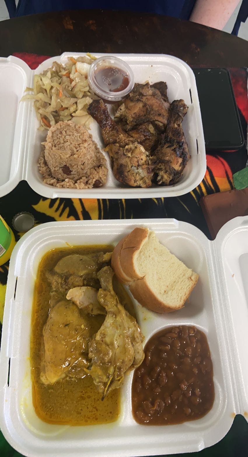 Read moreI don't understand how there isn't a line out of this place everyday. I went (based on a local's recommendation) on a Tuesday afternoon around 1:30. I was the only person in there, except the owner and a couple of his friends at a table. He immediately greeted me in true Jamaican friendly fashion. I got the jerk chicken along with rice & peas and steamed cabbage. A few mins later, a tower of food arrived. He asked if I wanted any "gravy" on my rice & peas, and I said ( just a little). What I didn't know is that gravy was his curry chicken. My father is from south India. We share many of the same spices/ingredients as Jamaicans (west indies). My father loved Jerk seasoning, so I've had my fill of it in my life. The easiest way to describe this food is that I would label it as "competition worthy." I think CB's could win awards with his amazing craft. If I lived nearby, I honestly think I'd be here at least once a week. I love that the menu is very limited. All it does is make your ordering process much easier. It's also a steal (price wise). You can EASILY get 2 meals out of one. Everything is served in take out containers. Run, don't walk...