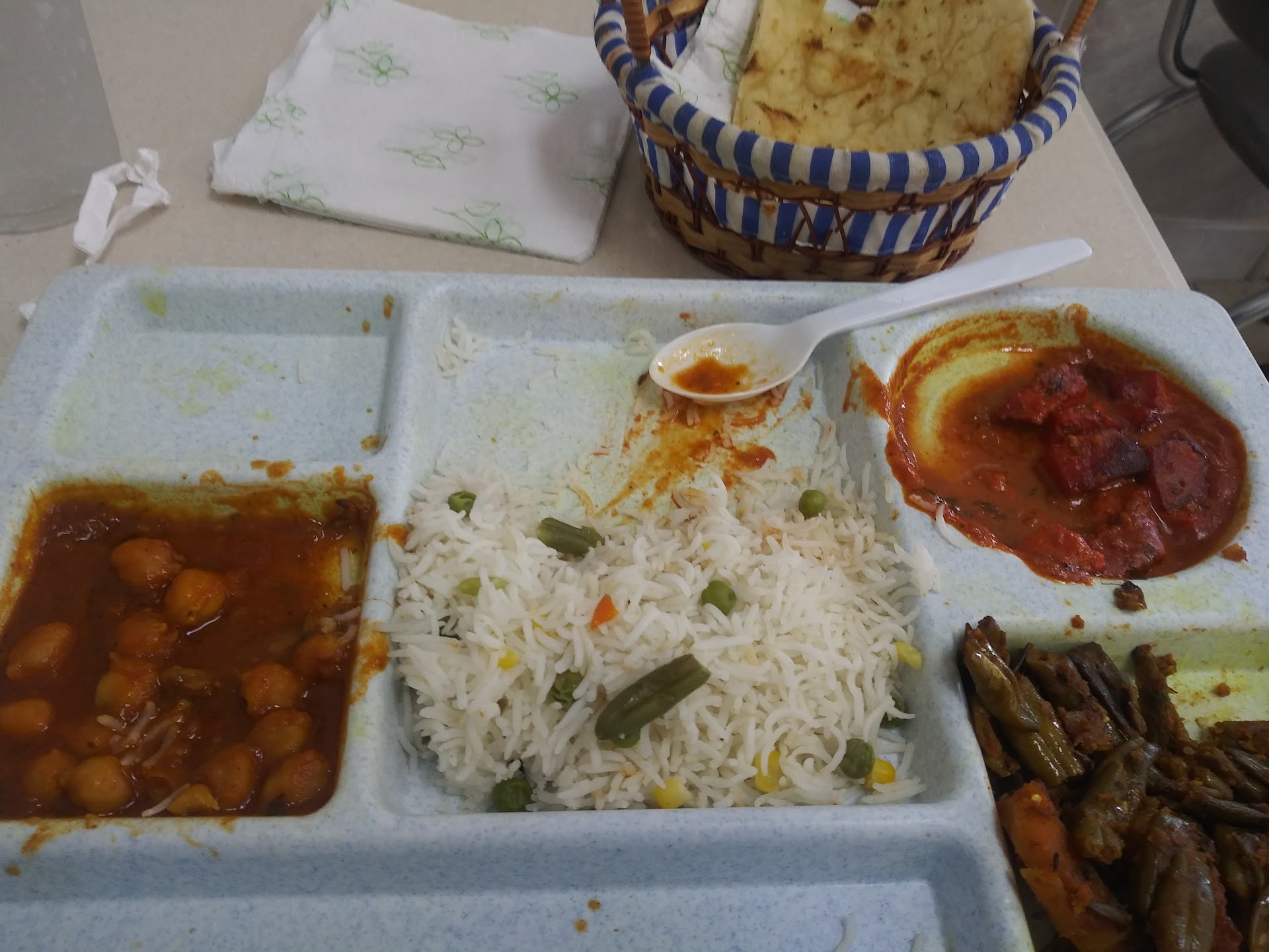 Then there is the appetizer. The picture with the strange chicken tandoori. It's supposed to have samosas, tandoori chicken, veggie pakora, paneer pakora, chicken pakora, and naan. The only one that was even remotely represented was the tandoori chicken. There should have been at least two pieces of naan, since each combo is supposed to die with it. There was one. Also, the rice was not normal Indian rice, it had green beans in it? Everything had the same strange rancid oil taste. I took just a small taste of things, but nothing was good.