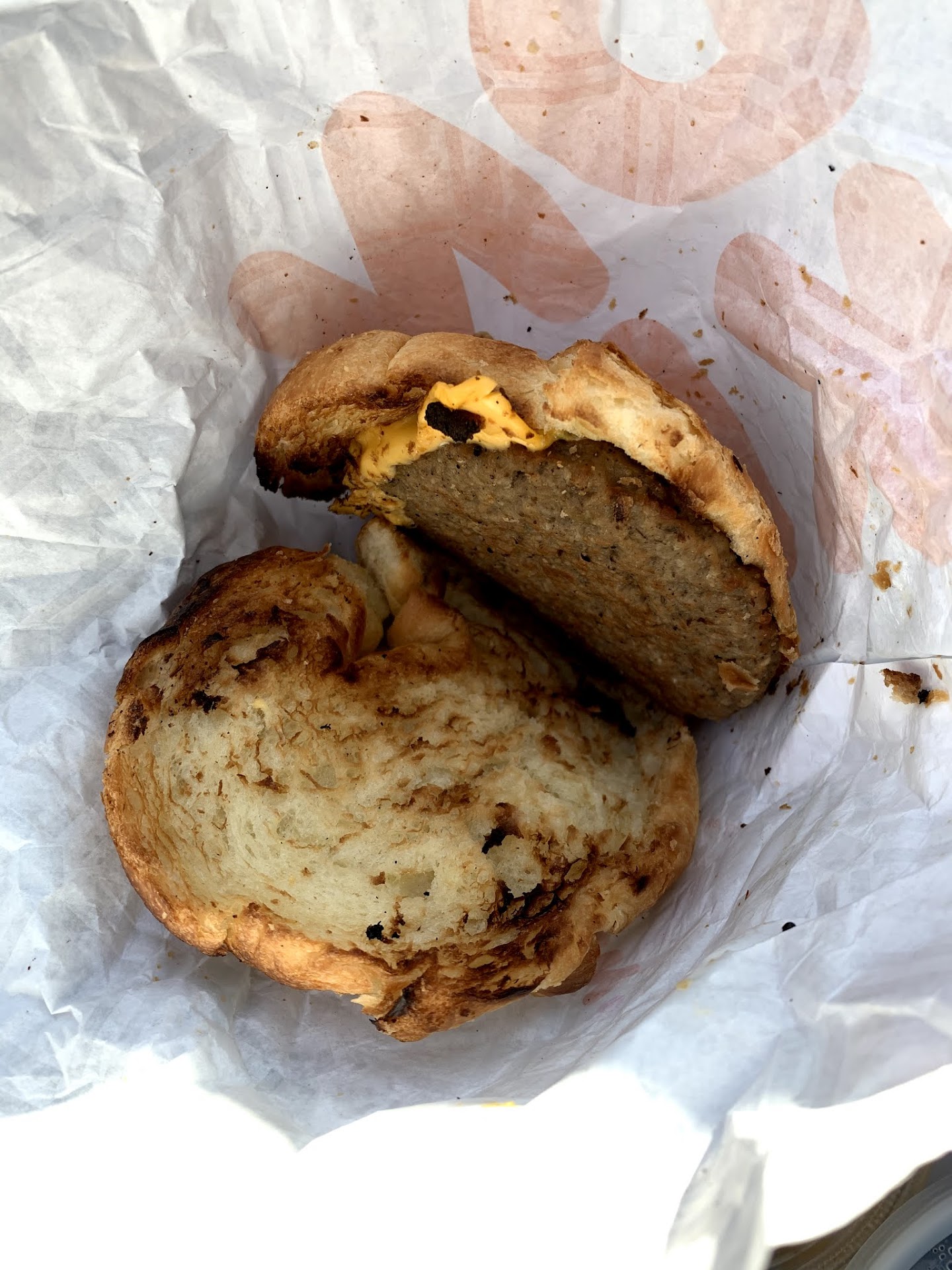 I pull up and wait. And wait. And wait. Blocking all kinds of traffic, so I finally pull into a spot and walk in the store. I explain that I was waiting on someone to bring out my sandwich with sausage and egg, with NO CHEESE.