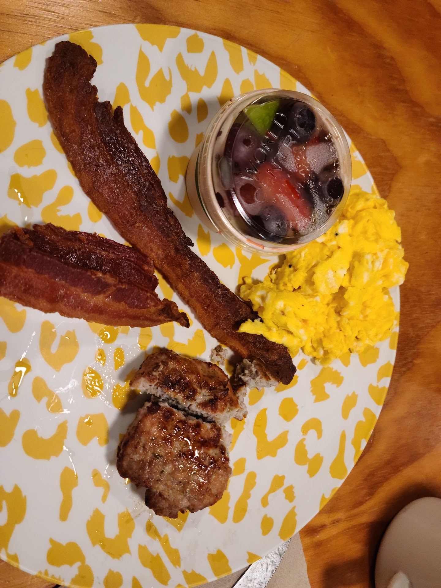 I got the ham sandwich, which was actually pretty delicious and all the flavors fit well together. Small fruit cup on the side. And I added a cheddar bacon biscuit on the side to try, which was good, but I think would have been even better with butter or something on it. My husband got the club and it was huge with a ton of added meat on it. They also accidentally gave us one of their special biscuits, which I didn’t realize since it was our first time there, but it was very sweet and a pretty good dessert after the meal.
