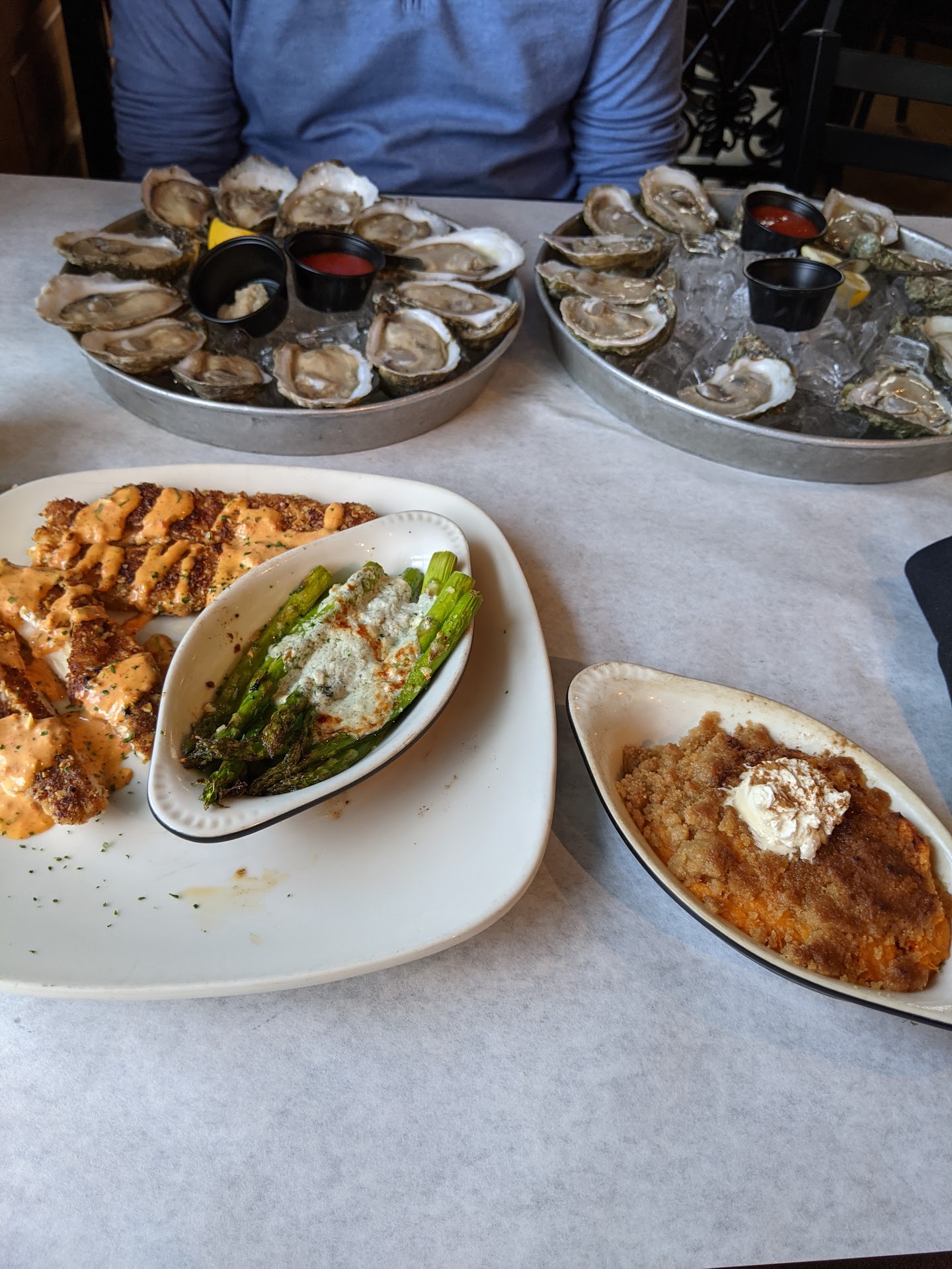 Quality of food: 10 of 10. I ordered a dozen local oysters and a dozen âTexanâ oysters, raw in a half shell. Wife ordered almond crusted chicken with chargrilled asparagus and creme brĂ»lĂ©e from heaven. I mean, sweet potato creme brĂ»lĂ©e. Food was prompt, served exactly as ordered and as promised by our server Wendelin! That creme brĂ»lĂ©e was incredibly decadent and well balanced! Oysters were fresh and the almond crusted chicken was packed with flavor and perfectly cooked.
