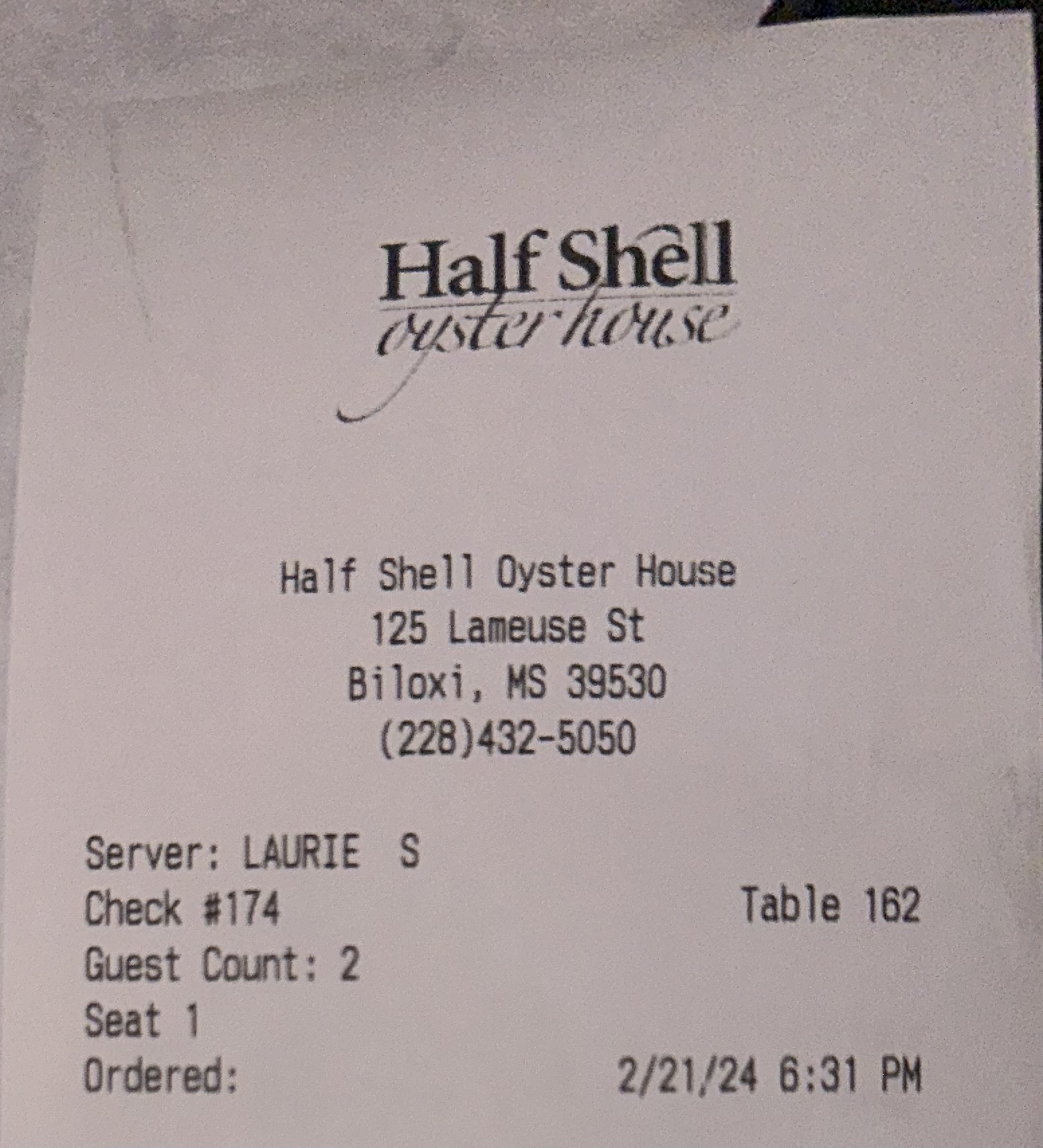 Customer service: 11 of 10. Similar to other reviews, each staff deserves to be recognized by name. Wendelin was so patient with us and checked in on us frequently without making it seem like it was a chore. She was inviting, excited to serve us, and that really made our experience worth sharing with our loved ones. We canât wait to âshow offâ our discovery of Half Shell Oyster Bar with our family and friends when we get a chance to visit Biloxi again.
