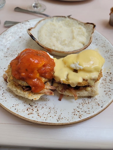 I had the Back Bay Benedict (I think that is correct). This dish comes with a fried green tomato, julienned tasso, gulf shrimp, a poached egg topped with tomato gravy on a fluffy biscuit. I got a side of hollandaise so I could try it because I am particular of the taste of mother sauces and this was actually good. I got a side of grits which were just underwhelming and disappointing.