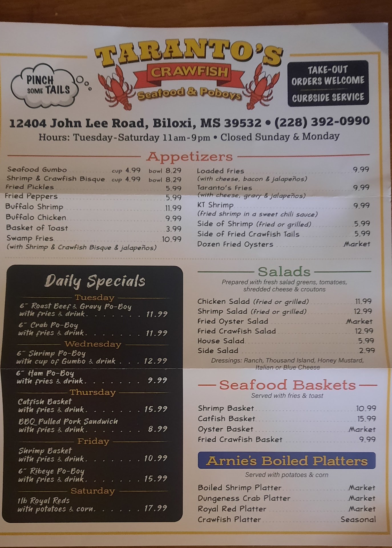 Read moreI called in an order and I arrived in the parking lot and parked where they told me to park. (Right in front of the front door) I pulled up and waited. I seen 3 waiters walking to cars and taking orders. Mind you 15 mins have passed by now and at least 5-6 cars came after me and left before me. I called in the store and asked them how long will it be, so a lady walks outside and gets are name (after we called and after a 15 min wait) she asked the server has anybody got to this car and the lady said no we will when we have time. So I just told them to keep the food and drove off. I then called the store and asked for the mgr. She got on the phone stating that they werenât trying to âpissâ people off they were doing the best they can. So when I asked her why were people who came after me were getting their order before me, all she said was somebody left their credit card and they were trying to stop them to return it. (Mind you that this person came after I arrived and waited 15 mins without anybody coming to my car) the mgr was so worried about that person she was not trying to hear me out or tell me why nobody came to my car to see if Iâve already ordered or needed to order. I will not be going back to a place with customer service like that. I ordered a 12â poboy and a crawfish platter. Wow! So I wonât recommend this place to anyone or have anything good to say about it from...
