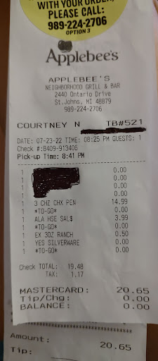 Read moreThis has to be one of THE WORST Applebee's we have ever eaten at. This review is more based on the service, and not the food. We were greeted and seated 6/4/25 @ 3:45 pm as soon as we walked in by a tall, thin young man with shaggy hair. Got menu's and gave our drink order and asked for a couple minutes to look at menus. This is when the visit went south. Pretty sure the young man that seated us was not a normal service staff as he was seating people, answering phones, and taking table orders. He disappeared, and we ended up flagging down another server and asked for our server. She had to go find him. He finally returned and took our order. He brought our drinks, and a few minutes later our app we ordered. Again gone. We had to go to another table to get ketchup. Food wasn't a long wait as the place was very slow. The young man brought out meals and was on his way. Again, we had to flag down another server to get my refill for the all-you-can-eat $15.99 meal. Asked for the coleslaw that was supposed to come with it, and oop! They were out of coleslaw! WHAT? When we were done, we had to ask another server to get a togo box and ask for our check. Our server never came back to check drinks, see how the food was, see if we needed anything. There was obviously no management on the property. Several of the servers that weren't waiting on tables were laughing and joking around about who was heading out back with everyone else while they waited for customers. At one point, one of the girls said she couldn't hear a song that was playing, so our server got up from a booth that he was setting at and went and turned the music up so loud they had to shout at each other. IT. WAS. A. DISASTER! Our server finally brought our check and waited for payment which was cash. He took the bill and the cash and he was gone. We never did get a bill we could keep. NEVER AGAIN ST. JOHNS...