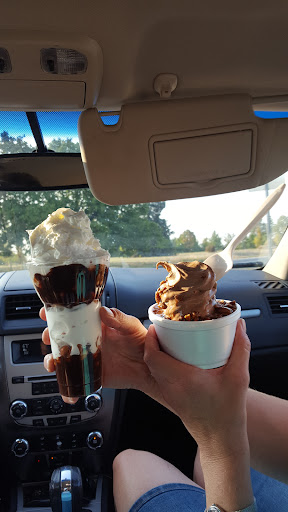 Read moreI guess I didn't realize it was soft serve only, but as you can see from the menu, there are lots of different ice cream options and specialty items. You can either order and sit outside, while you listen to country music or utilize the drive thru, which seemed like the majority of people decided to do when we were sitting there. The picnic tables are in the shade, so that was nice. The only thing I'd say, is to have an ice machine. When I asked for an ice water, I was told I could get a cup of tap water without ice or buy a bottled water. We ended up buying some pops. No biggie...I just personally enjoy ice water instead of buying bottled water. Side note...there are ice cream treat options for pets I believe, unless the lady brought her own dog bone treat and asked them to put it in a bowl. Overall, great experience. Will be...
