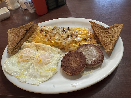 Service was great very friendly and always with a smile. Food was ok what you would expect from a small town Cafe. Prices are low for portion size. My knock with the food was the sausage gravy which was flat/under seasoned and the over easy egg was broken and yolk was all but non existent. Sour dough toast was good and the hash browns were cooked perfectly.