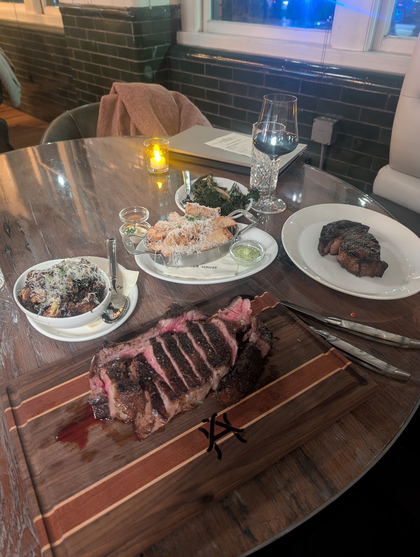 I appreciated that the menu wasnât full of the usual staid steakhouse suspects (Iâm looking at you, creamed spinach, as much as I love ya). The tuna crudo and pork belly starters were absolutely delicious, and very shareable in their generous portions. Fresh bread service from local Henkelâs Bakery was a nice compliment.