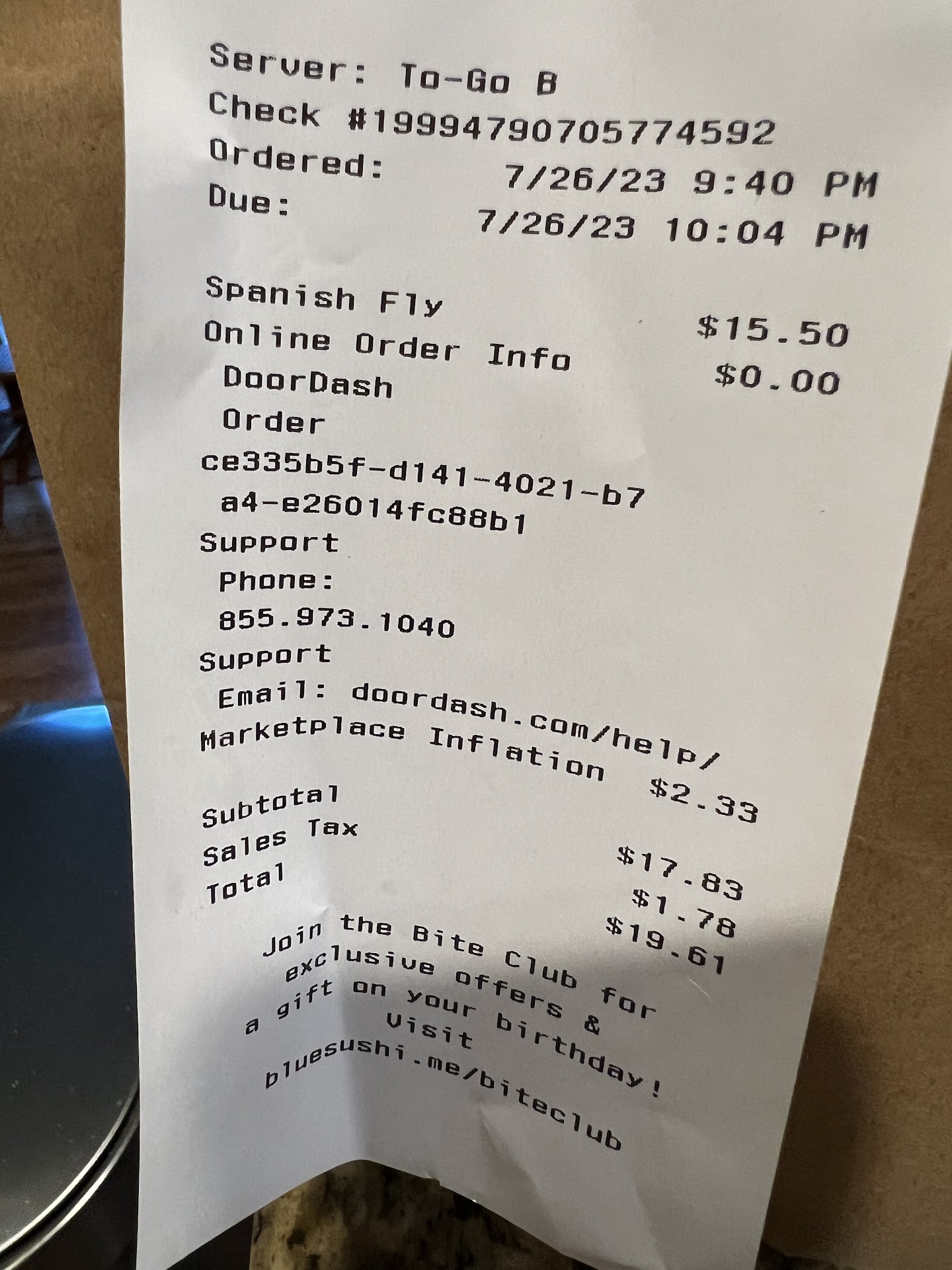 Our sushi arrived long after my appetizer arrived. The presentation was, pretty good, but not great as some other reviewers raved and showed pictures. I mean, this place was supposed to be a 4.6 Star average of almost 2k people. Nope, not for us. Sushi, was bland, with a taste lacking freshness. The shrimp felt rubbery and the salmon tasted somewhat different.