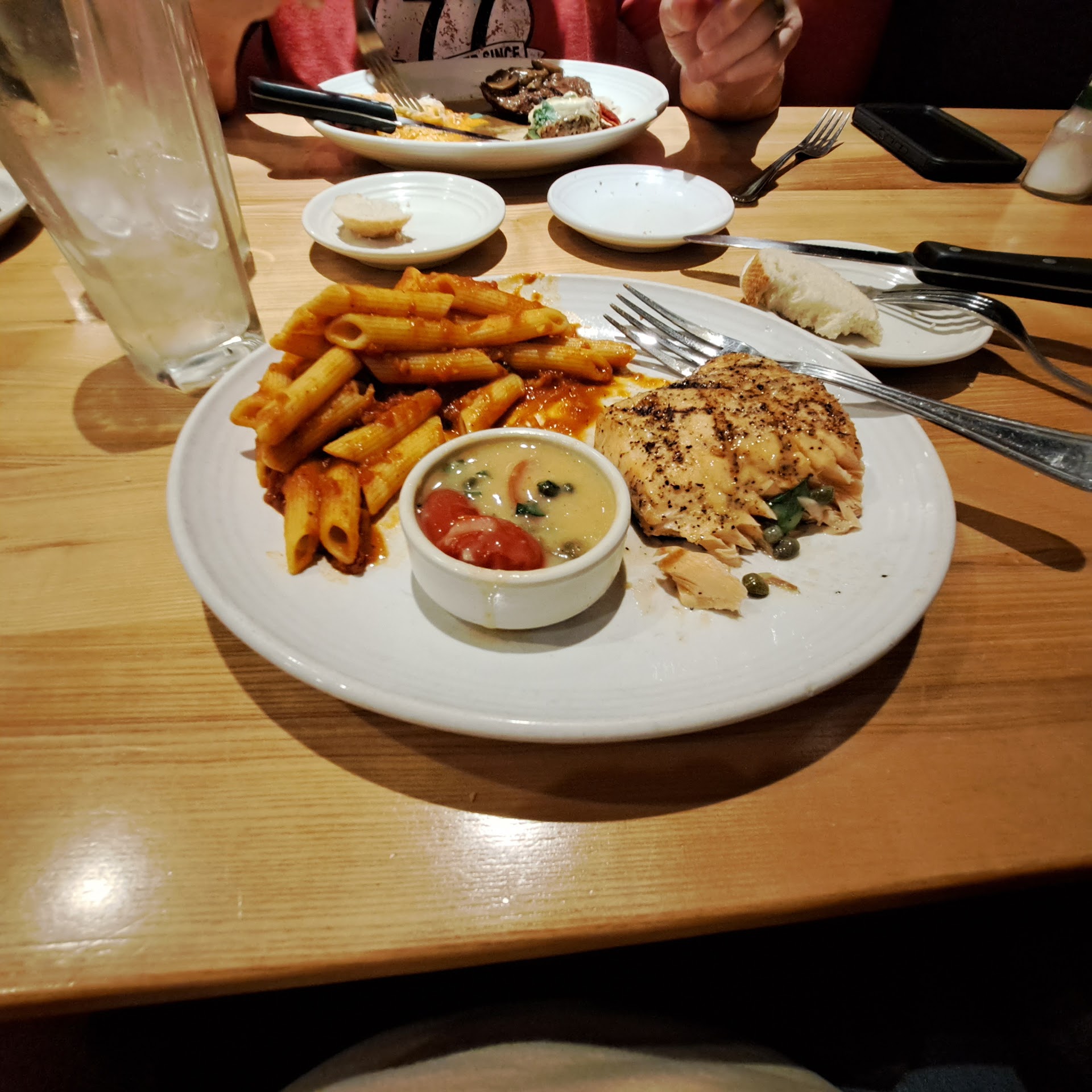While scrolling my favorite place, Gmail (đ) I stumbled across an email from Carrabas. They advised me it's been awhile ,they missed me and swnt me $10 loaded to my Dining Rewards account. Say less ! After an evening shift instacarting and ubereats delivery ,I decided I deserved a cute solo dinner on the patio . I made my commute and was quickly seated on the patio. Mind you it's a humid Saturday evening and I'm sweet as pie, so I have no idea why I thought that was a good idea... within 3 mins I was ATE UP , the bugs devoured my feet đ. After some time ,my waitress Tee finally found me . By this time ,I had decided on my dish and ordered right away .