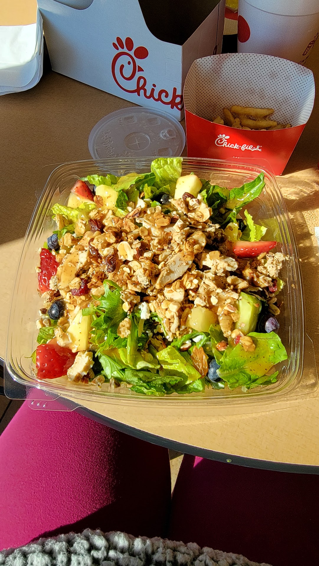 I've eaten here many times, and never had a problem. Saturday, I ordered a #1 meal (chicken sandwich, fries, drink), and that's what I got, which is why I rated them 3-stars. The employees were all very polite, but... I walked down an entire row of seating but couldn't find a clean table and seat - they were all greasy and had crumbs everywhere. They werent busy inside, as I was the only customer other than DoorDashers, and less than 6 cars in drive-thru, so someone should have cleaned the seating area. Finally found one on the 2nd row that wasn't greasy, only had crumbs which I wiped off. Took over 10 minutes to get the food, which is the longest I've ever waited at any Chick-fil-A. The sandwich was good, but the fries weren't completely cooked. Not way-off, but enough they had that 'raw taste'. When i ordered, the total was $9.80, and I gave him a $10. Even w/o a register he should be able to count well enough to know he owed me 20 cents, so having a register that tells him he owes me 20 cents should make it a no-brainer. I was given 2 nickles. When I pointed out (several times!) that he owed me 20 cents and gave 2 nickles, it took another employee telling him he gave me 10 cents but owed 20 cents for him to attempt to correct it, by giving me an additional quarter. It was as if he thought the nickles were dimes. It took another try to get it right. No, I didn't ask for a manager at any point. It was late (about 9 pm), this was not a great part of town (Roebuck, AL), and it's not the sort of area where you want to draw attention to yourself. I wouldn't have stopped, much less stayed, but I was tired, hadn't eaten all day, and thought Chick-fil-A would be a safe place for good food. I think I'll skip it on...