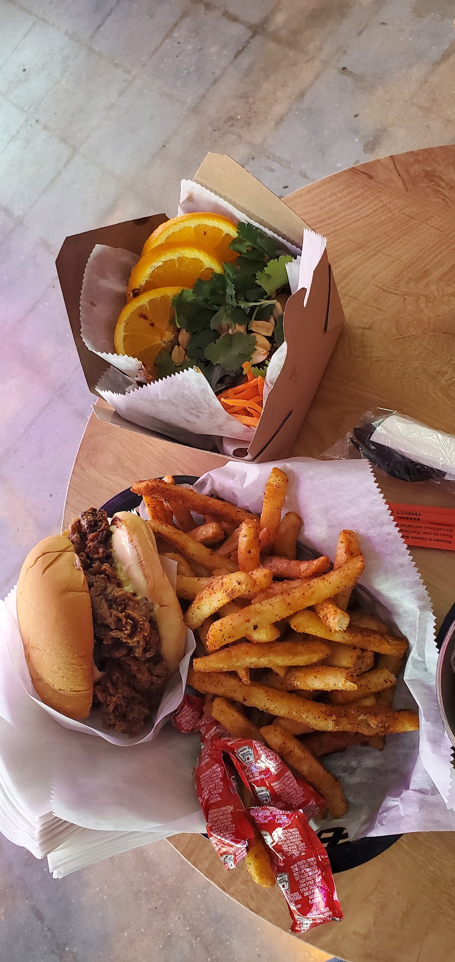We went around 5 on a Friday afternoon and we're well ahead of the crowd. We ordered food from their truck outside then went in to order a couple of drinks. I got a Thunderball and it was very well made. Not overly sweet and good balance of flavors. The Asian inspired food was really good too. We got a chicken sandwich and spicy cold noodles. We both loved the sandwich & fries but the noodles were too spicy for her, and probably for lots of people. The flavor was good and I'm sure he could tone it down if requested. The chef was alone and performing heroically, probably busier than expected at that time. The interior of the place is modern '80s with lots of neon-ish leds around. Nice, if a little bright. It does not look like a dry cleaner any more. We'll...
