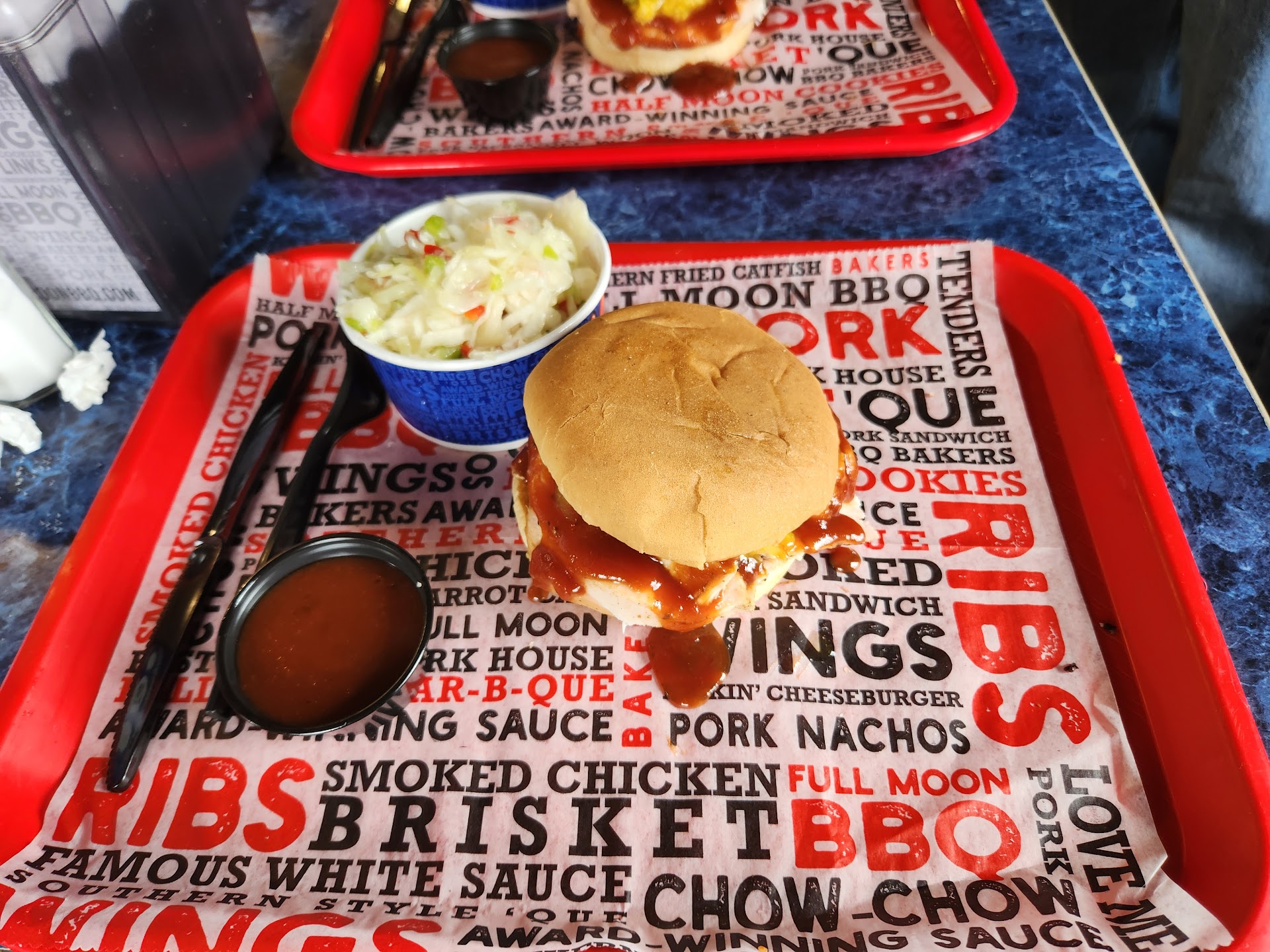 Read moreAuthentic BBQ ya’ll. When you step out of your car and smell the smoke down the street you know it’s going to be a great meal. There are quite a few FullMoon’s around the area but I wanted to eat at the original location. I was traveling south on 65 and it took a bit longer to get to the location but it was well worth it. It’s a small place with about 30 seats, the walls are lined with autographed sports pictures of athletes that I assume have eaten there. We arrived around 3:30pm and half the place was filled but it only took a few minutes to be served. I had the rib plate with coleslaw and Mac n cheese. The coleslaw was unique for sure. It wasn’t a mayonnaise based slaw it seemed to have a mixture of relish and spices. Much different than what I’m used to but it was really good. The Mac and cheese tasted homemade. I wish I would have tried their potato salad because it looked good. The spare ribs had a good smoke ring but didn’t have much of a smoke taste. The chicken my wife had was very tender and flavorful. I guess it’s their tradition to mop the top of the meat with sauce but it works because the sauce had a good taste as well. They also have a spicy chow chow that is super flavorful. Bottom line, the next time I come thru Birmingham I will stop...