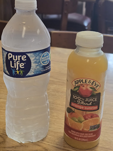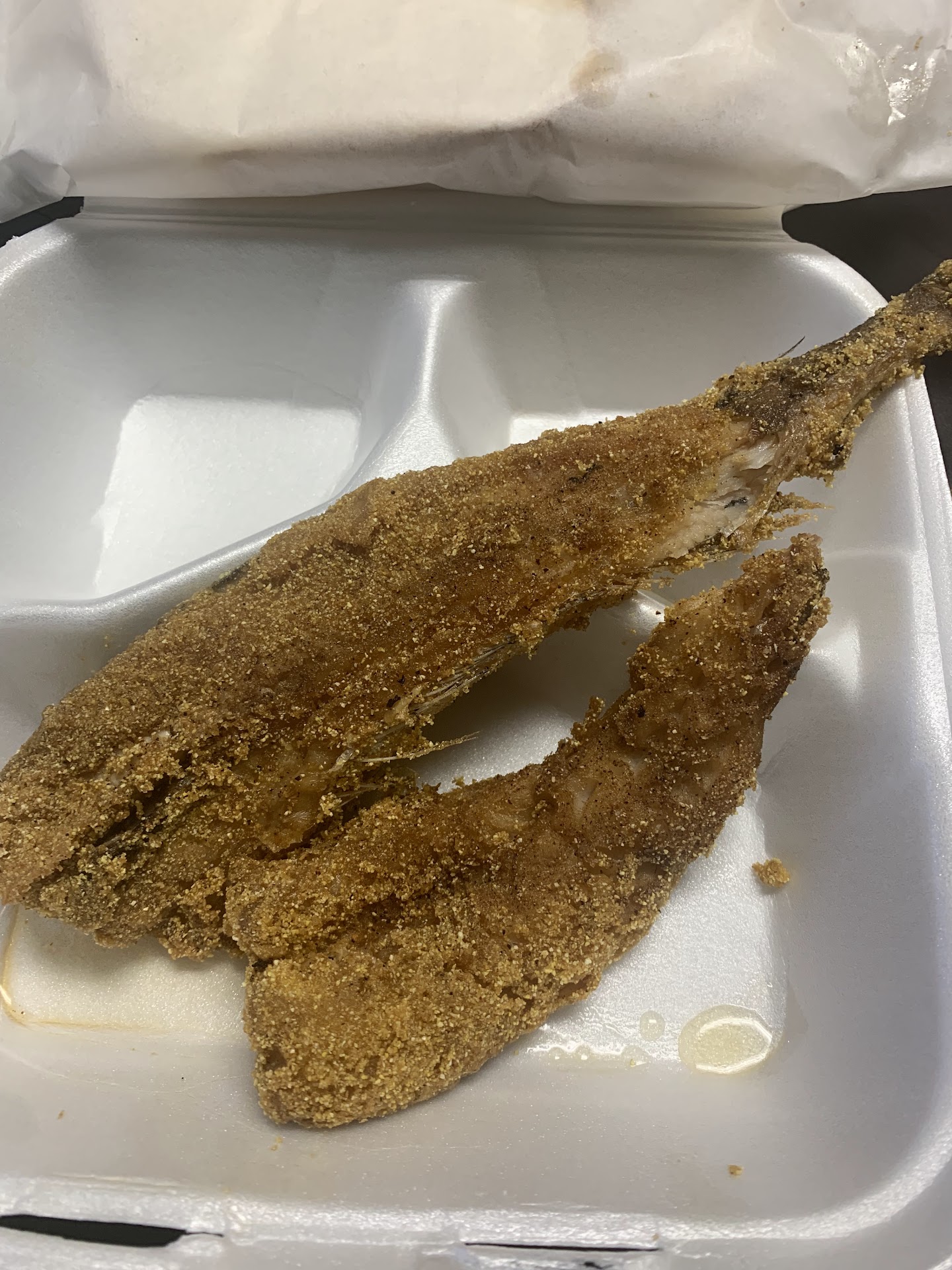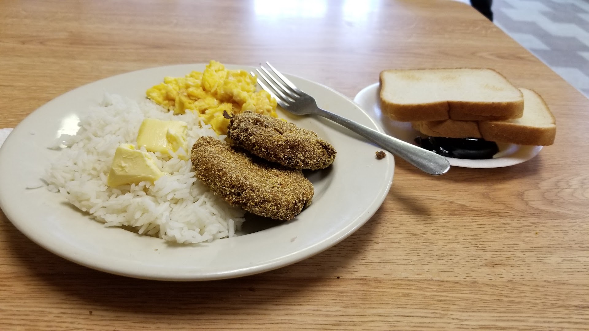 I ordered Salmon & Eggs it comes with toast and grits or rice. I ordered grits ½ of it was undercooked with lumps. Eggs were decent. I ordered orange juice and ice water. The toast would taste better buttered. The salmon is dipped in a breading then cooked resulting in the outside cooking faster than the inside so you end up with an overly crispy outside and a mushy undercooked inside that was more bread than salmon and unseasoned.