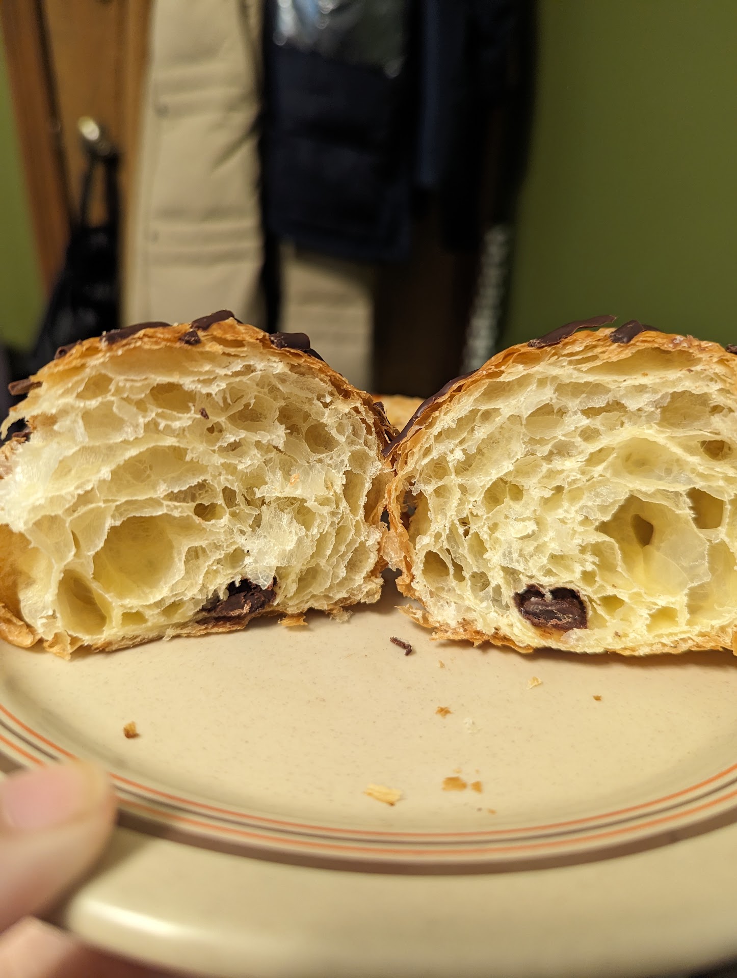 My first visit was nice. It's a cute little bakery/café to sit and have yummy pastries and coffee with friends. What I am not a fan of is not having prices on ANY of the pastries. Customers don't know how much they are paying for ANYTHING. So once you get to the registers, you get sticker shock because you just have no idea how much anything costs. There is only one cake in the showcase that has a price, nothing else. Now my first time I chose a croissant that looked to have been dipped in dark chocolate and it was described to have chocolate filling. Perfect, it was delicious and was exactly what the description said! Delicious and had a nice amount of chocolate cream inside. This second visit, I chose a different croissant that had chocolate drizzle on top and described to have dark chocolate filling inside. Well, my picture clearly shows you how much dark chocolate was inside. I was extremely disappointed. That "dark chocolate filling" is smaller than my pinky finger and I believe this cost $5 and some change, I can't remember. I just remember cutting into this and feeling so disappointed and cheated. A change in description needs to happen. I'm sure I'm not the only person that has bought this croissant and thought the same thing when I cut it open. Highly disappointed with that! I will eventually return but I doubt it will be as often as I'd like. And I will no longer be choosing this item...