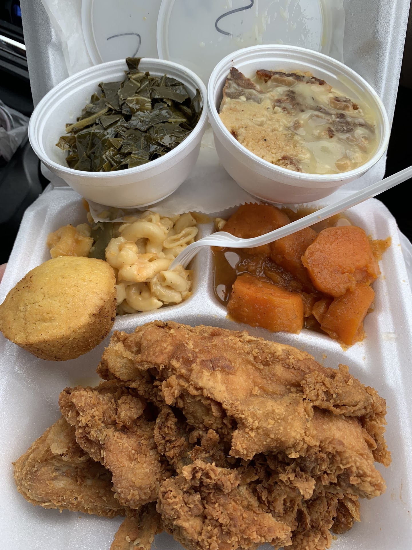 The collard greens had a weird sweet taste to them for some reason, idk why??? But they were fresh, green and not over cooked. The cornbread had a slight sweet taste as well and seem like it was cooked the day before and needed to be cooked some more so it could be flaky instead of just soft. It also needed some extra salt and butter.