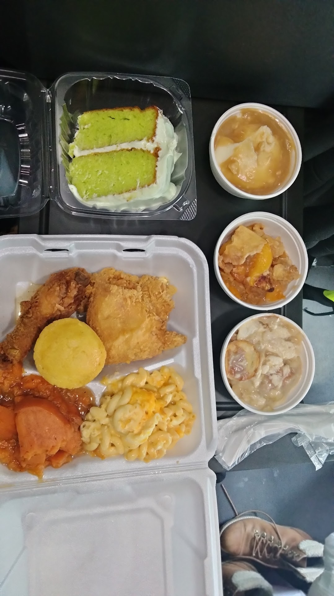 Eventually I placed my order and paid $12.65 total for a piece cornbread, a small drumstick and leg quarter with a small portion of Mac n Cheese and collard greens.