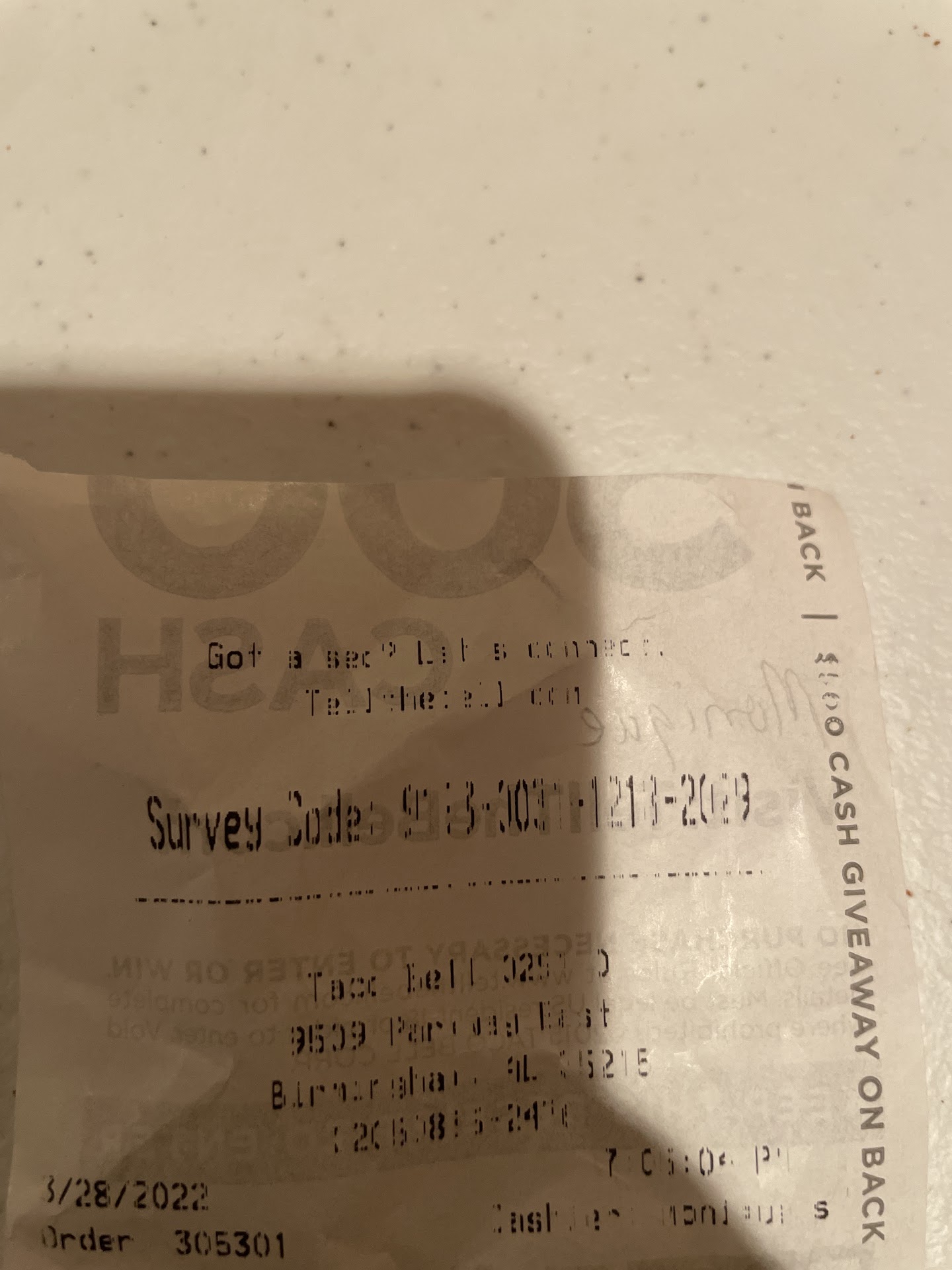 Read moreI went to this Taco Bell last night to order food, after waiting so long in drive thru, got the order and drove off. Get almost home only to open the bag and find a roach crawling on my food. I turned back around and went back to the store in the lobby to take the bag back. Told the dude at front register with ponytail about it and he starts being rude, saying they don't have roaches, I dumped the bag on the counter and the roach fell out, then he says that's a house roach, while continuing to be rude and disrespectful, as well as the other employees on duty, no manager present at all to address the issue and to control the staff. If there was a manager there, they didn't make themselves known at all. After getting my money back, he walked outside behind up threatening to beat our a** and calling us some sissies. (Very professional huh...when you could have just said I apologize for that roach, let us remake your food, or give you a refund, even tho I would not have wanted anything else from there after seeing that one roach) No professionalism, unsanitary, rude and...