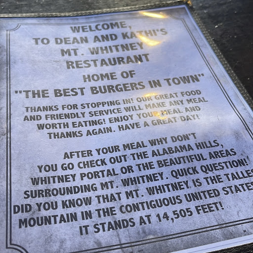 Read moreMount Whitney restaurant serves American food. It advertises as comfort food and it delivers what it advertises. My son and I opted for chicken fried steak my husband got the Burger and fries. My husband said his burger was average and said it rated about a 3. He concluded that it was not the best Burger in town, as advertised. My son and I thought the chicken fried steak was about a 4. The potatoes were perfect, and topped with decent gravy. The beef, however, was a bit overcooked, and required the exercise of the knife. The deep fried corn was a unique preparation we enjoyed. When we were finished we were full. No desserts were needed. The menu had many American dishes from which to select. There were appetizers, salads, desserts, main dishes, etc. The décor is all about the Alabama hills and the movies filmed in and around the area. There's a piano and old stove, and many memorabilia from times past, and photos of stars. Parking is on the street and also in a parking lot right next to the restaurant. I never noticed any handicap parking or handicapped facilities, but handicapped persons probably could be accommodated at this restaurant in any event. All the staff I met at the restaurant were professional, efficient,...