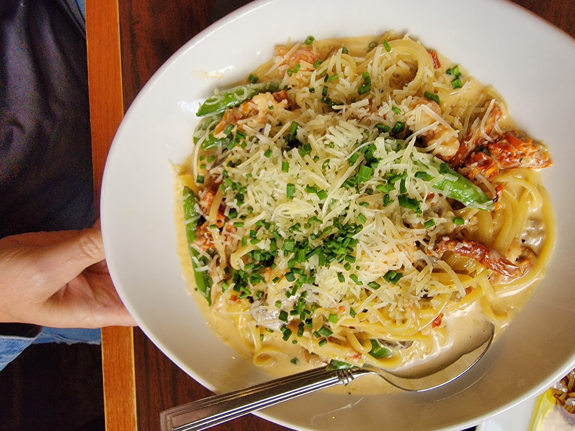 Read moreThe menu is centered primarily around seafood style dishes but there are steaks, burgers, and pizzas available. Complimentary free bread is offered at the beginning of the meal. The 30$ steak I ordered was overcooked but still delicious. The prices are higher than other restaurants in town but I cannot speak for the quality of the food as I don't know. The kitchen made an error with my husband's meal and had to remake it. They apologized but he had to sit and watch the rest of us eat while he waited for his food but they were fairly quick as we came in at a slower time. The waitress was very attentive but continuously reached over our food as we ate. The adult beverage list was disappointing to me but they offer a variety of different wines on their wine menu. No other drinks were advertised but there seems to be a full service bar. Overall, we did not feel a meal for three was worth $100 here but I feel people should try it...