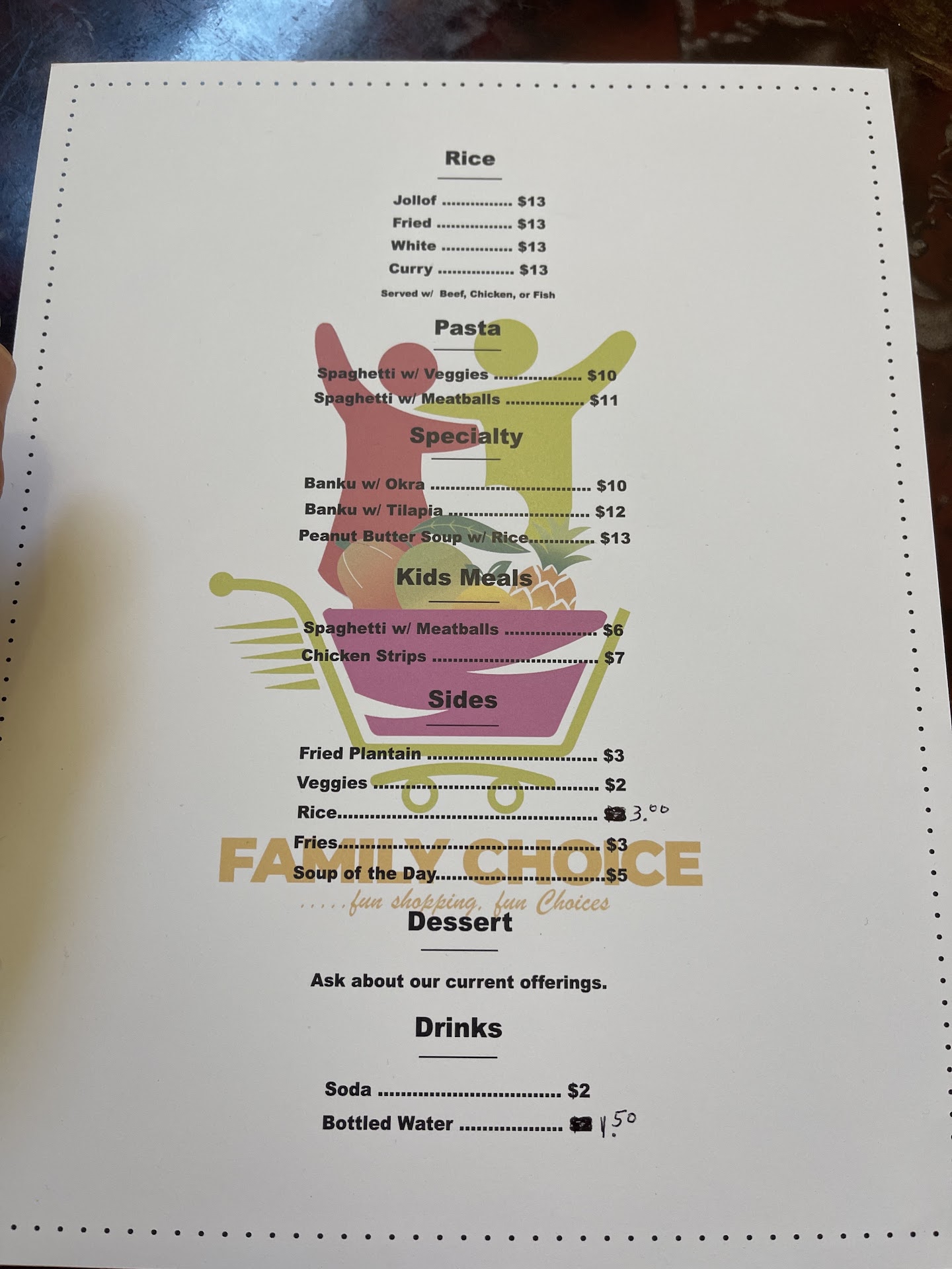 Read moreEverything Healthy is what you get(Homemade food) For a long time I have been wishing for a African eating place in Bismarck. Family choice finally did the kick. I love the foods, staff, and the place. You got to try their fries rice, Jollof rice, peanut butter soup, chicken and so much...