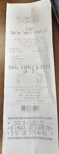 Read moreMy wife grew up in Virginia with Hardee’s so whenever we travel we look for Hardee’s or Carl’s Jr for her beloved biscuits and gravy. She was excited to see there was one in Bismarck and the breakfast (I don’t eat biscuits and gravy) was great for both of us. Employees not only showed up for work on time (we routinely experience restaurants closed early morning when they’re supposed to be open) but the breakfast was hot and fresh and the restaurant was clean and as we ate the employees were all working hard to get the restaurant ready for the day! Refreshing to see doors unlocked upon the restaurant opening, friendly staff, hot and great food plus employees caring about getting the restaurant ready for the day! So happy to see their commitment to their jobs that I felt the need to leave a review. You guys are awesome and deserve it (direct quote from my wife) and we’ll be having breakfast again there tomorrow! Thanks for providing the extra mile and caring about your job and caring about your job enough to make my wife so happy that she insisted on...