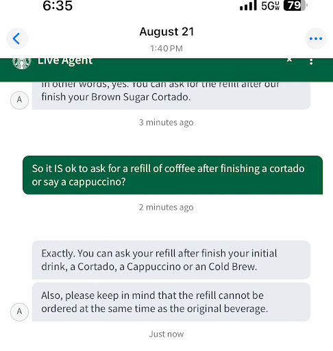 So I had a text chat with Starbucks headquarters and they confirmed that we should get refills of coffee for the purchase of a cortado. Of course it must be consumed in store with correct beverage container. Hopefully owner and managers (Hannah and Hope) will be made aware of this so that can teach the baristas the correct policy. Otherwise love this place...