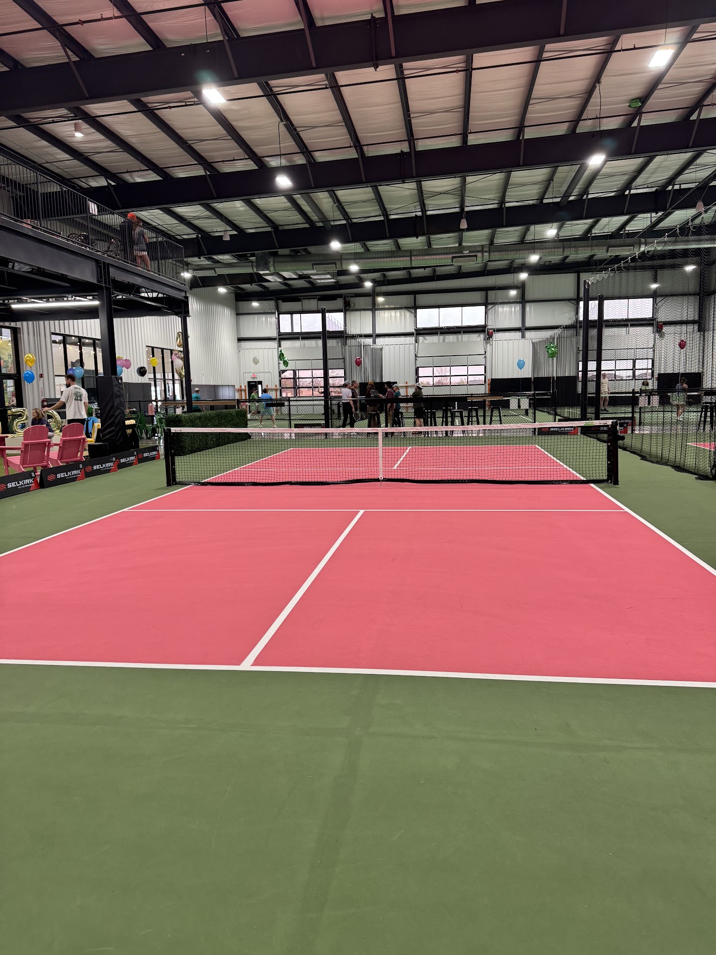 The atmosphere was very neat, lots of seating and very spacious. It had a loft with darts, multiple pickleball courts, life-size connect 4, and bean bag toss.