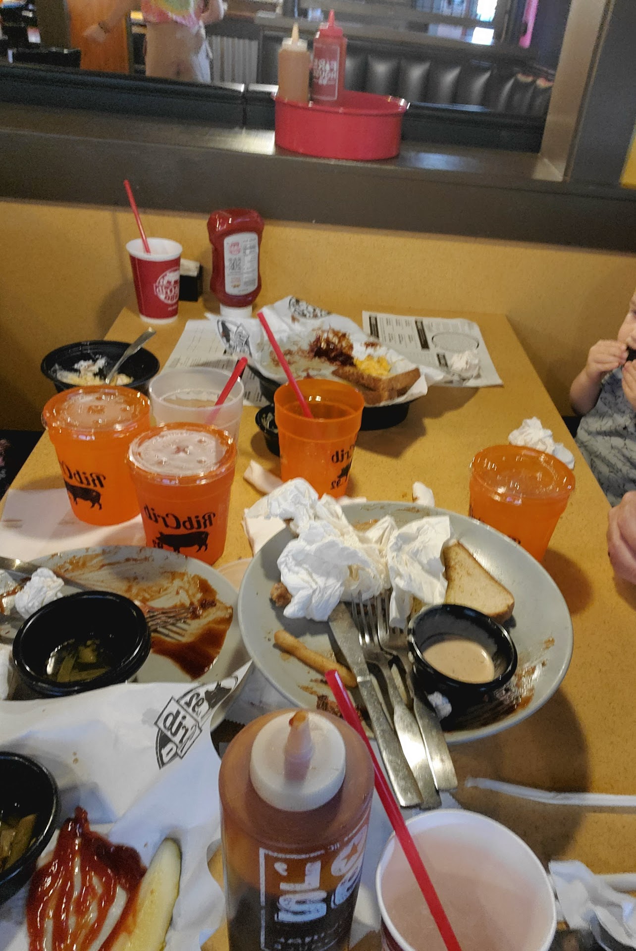 We were seated immediately by a super kind hostess. About five minutes after being seated our waitress walked by and said be with you in a minute. Ok- cool. After taking payment from someone at the front, helping two other tables- refills, Togo boxes, payment, and chatting in the back with a coworker, she came and took our order (10ish minutes). We wait another ten minutes and no drinks. A kind teenager brought our appetizer out and I asked him if we could please get our drinks. Our waitress was at the computer leaning again the counter talking to another waitress. He brings us our drinks and apologizes. I got up and asked the hostess for crackers because our one year old was getting fussy because it was taking so long to get our food. I was told they don’t have crackers, which surprised me because every location I’ve ever been to does. Another waiter came out with our food, which was good. I feel portions left a lot to be desired. For the price I think there are better BBQ options in Tulsa. But, lack of being waited on really was frustrating. We had to ask for refills, was never checked on or asked if everything was good, and just the lack of service was bothersome for the price of the food. Our order was taken and that was it. I hope this was just an off day, but I’m...