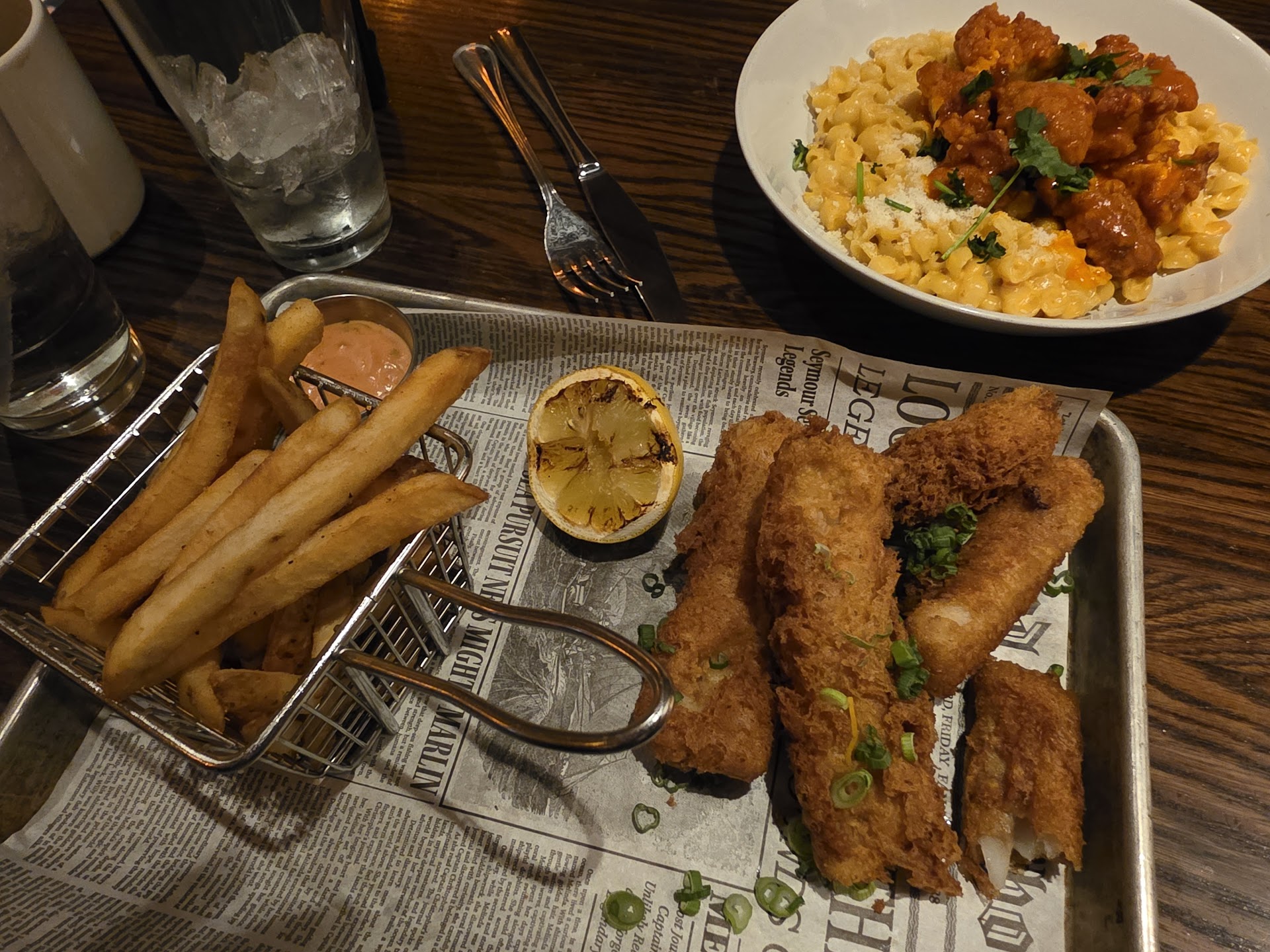 I took a risk and ordered the Filipino adobo pork belly. I was expecting a spicy sauce, but it was more sweet and sour. Pork belly was new to me, fattier than a pork chop, but more tender and tasty. The spinach accompaniment was a delightful contrast, earthy and garlicky. The dish is usually served on a bed of mashed potatoes, but I was hungry for fries. Next time I'm going to eat it their way. The best thing--I cook like a madman at home. Because of this meal, Filipino adobo is my next cuisine challenge.