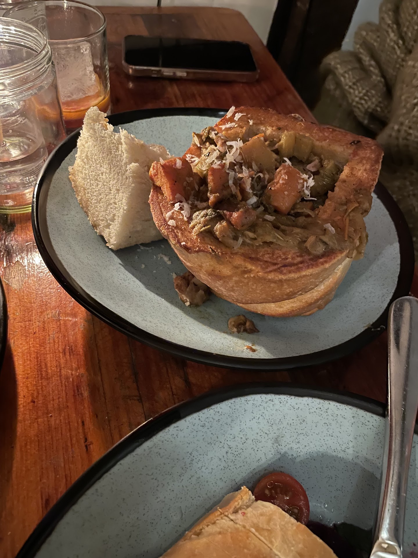 There was also a live band playing, which was delightful. They have an outdoor band stage area. There is also a fire-piit, so it feels a bit celebratory, like you are hanging out in a best friend’s yard, who also happens to have animals. That said, this outdoor party-vibe led to more than a few free-range children. Some children were running around the fire pit and dancing around to the music and not particularly well-attended, so they were a bit underfoot if you’re trying to have a romantic meal. But again, if you’re there as a family and just wish a joyful outdoor/barnyard/fire-pit/musical experience, that feels like you’re camping with some friends, then this is the place for you. On to the food. The food was excellent. And really unusual. I’ve never had some of these dishes, and that is unusual for me, because I have a really large palate and love to try different cuisines in different countries. Certainly I have had peri peri chicken before, and this was a excellent version of it, the wings were really very large. But I had never had my main course, (bobotie) which was sort of a meatloaf situation. My husband had one of the meat pies. We would absolutely go back for the food.