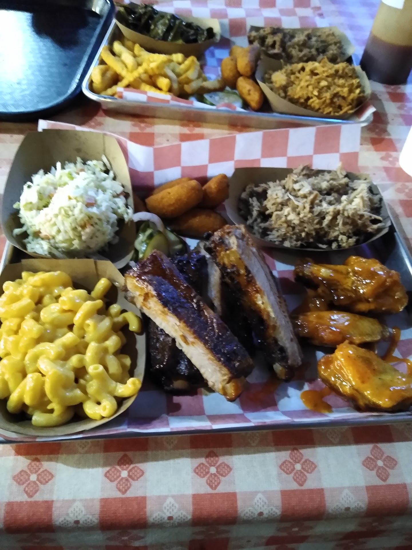 Read moreMy girlfriend and I had a foodie road trip today, starting in Asheville and ending in Black Mountain. Phil's was our choice for dinner. *Sidenote: If you have the time when visiting Asheville, Take the extra 20 minutes drive to Black Mountain (recently voted one of the best small towns in the US) Back to Phil's... I ordered the 3-meat dinner. The ribs, Amazing! St Louis style, light sauce, dry rubbed, slow cooked to fall of the bone perfection. Smoked wings were definitely different from the greasy fried wings we're used to back in Pittsburgh, but a good different. Different texture without the crisp, but the flavor is was there. Chopped pork with any of their 5 house sauces. *Inside tip: Mix the Carolina vinegar, Mustard, and the Classic sauces. Cole slaw reminded me of my grandparents' slaw... Not too much vinegar..not too much Mayo.. dash of pepper. The little kid in me can never pass on Mac n cheese, so of course I had that as my 2nd side (Don't judge, but this was my 3rd Mac n cheese side in 3 days haha) Highlights of my girlfriend's meal: The collards were delicious! (Don't tell Tupelo Honey, but Phil has them beat) She also had the chopped chicken and could not put down the bottle of Alabama White Sauce (think the Mayo and Vinegar mix in coleslaw). I think they had to refill the bottle when we left haha And lastly, while I was filling our soda cups, I caught a glimpse of the BBQ...