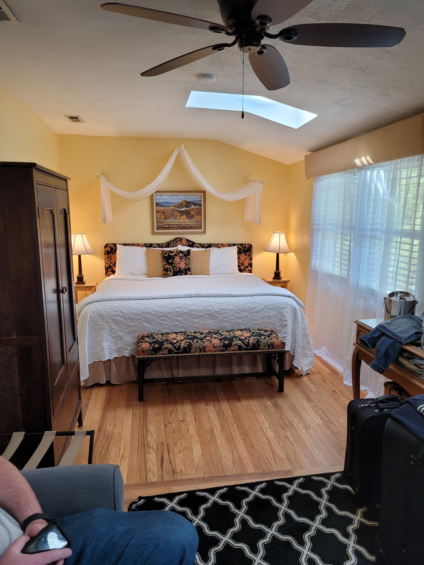 Read moreThe historic inn seemed a nice change from the chain hotel at which we usually stay, but our one night visit here in early April was basically a disaster. The owner & manager were very nice & accommodating, but we had several issues with our room & the inn. First, the (lovely, old fashioned) key to the room didn't work. They did try to get it to work but it was tricky. The inn was very chilly inside, so we asked if the heat would kick on as the evening progressed (no thermostat in our room). We didn't get an answer but they said we could turn on the gas logs in our room. We tried that, but they didn't ignite, so we asked if someone could take a look, & the maintenance guy got them on, which warmed up the room. However, during the night, they went off and we weren't able to get them back on, so the room was freezing cold. I looked for extra blankets but couldn't find any. (I was told the next AM there were some stored under the bed). Went to take a shower and there was no hot water. I ran the water a couple minutes but it didn't get hot AND the drain immediately got stopped up, so water began quickly accumulating in the shower which had a door flush to the bath floor. It was a newly renovated bathroom- very nice. I took a 30 second cold shower; turned off the water and waited several minutes for the standing water to subside, but it didn't drain at all. So I quickly opened the door & closed it as fast as possible in order to get myself out of the shower. The water flowed into the bathroom floor and I threw all the towels on the floor as fast as I could to minimize any potential damage. (Turns out it did flood to the floor below). My husband didn't get to take a shower, needless to say. He could have used the cute footed bathtub in the bedroom next to the bed, but it was about 55 degrees in our room & since I didn't have hot water in the shower, he opted out. We went downstairs to breakfast, and it was very chilly in the dining area, even tho the fireplace was lit. We moved to another area where they did have some heat turned on. Thank goodness, the breakfast was lovely: home cooked and very substantial. They are trying very hard to make the Red Rocker Inn a nice & comfortable place to stay, but unfortunately our...