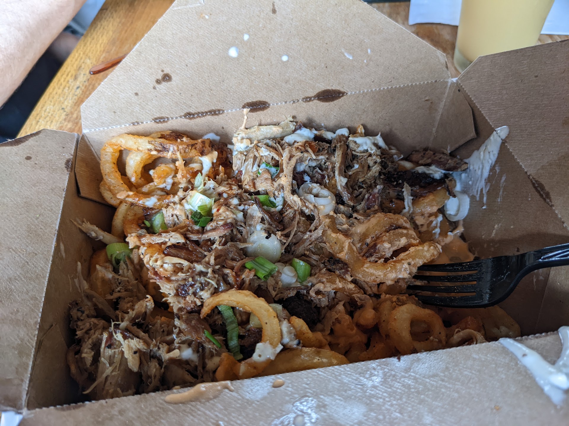 The poutine was very spicy, so watch out. It was a huge serving of fries and meat, but sort of dry. We would recommend splitting this between 2 people.