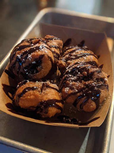 We arrived at around 6:40 on a Friday evening. We had no trouble finding a seat for our group of 3. Right away we noticed the mural on the wall. It was the entire wall and was engaging to look at. We took a little time to peruse the menu. What we noticed was that because it was a ‘fancy’ place there was no option to turn something into a combo. The fries and onion rings weren’t even listed under ‘sides’ they were under ‘snacks’. In my head I’m thinking they must be so large they feed more than one person, especially at seven dollars for fries. We were wrong! They came in a small bowl and were entirely underwhelming and undeserving of the price point. The onion rings were priced at ten dollars and were whelming but also undeserving of the price point.