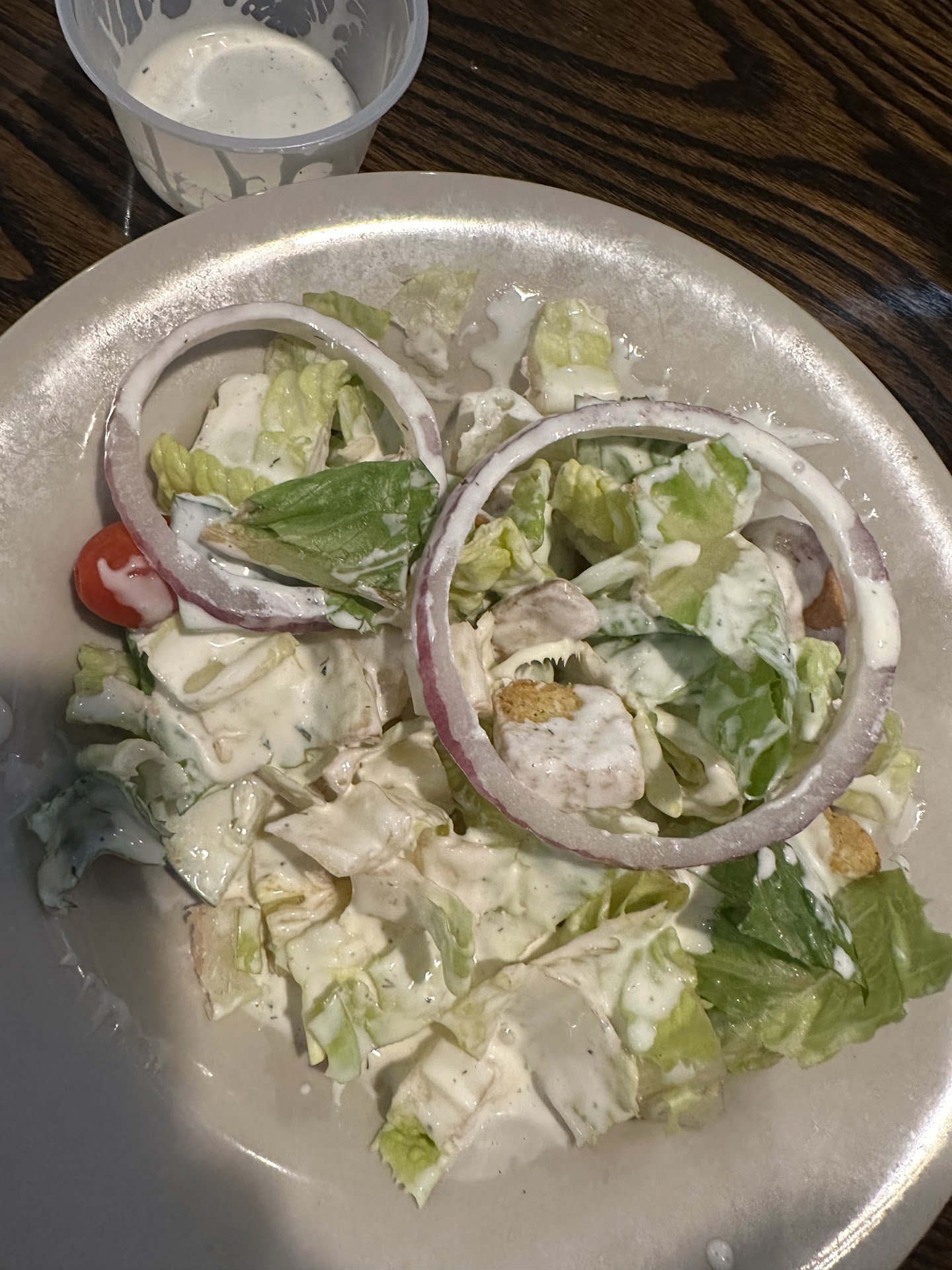 I ordered a cup of chili and a smoked chicken Caesar salad. I was served the chili and a smoked chicken sandwich. I notified our server and he brought me the salad and said I now had a free sandwich. Caesar salad was nothing but Romaine lettuce with some shredded cheese. The smoked chicken was three pieces of cold chicken breast. The chicken had no flavor. I gave my wife a piece and she could not detect any smoked flavor nor any other flavor. I tried the chicken in the sandwich, and that chicken seemed to have some smoky flavor. The chili had an odd sweet taste. I was a little surprised that my chili wasnât comped considering the weak quality of the food.