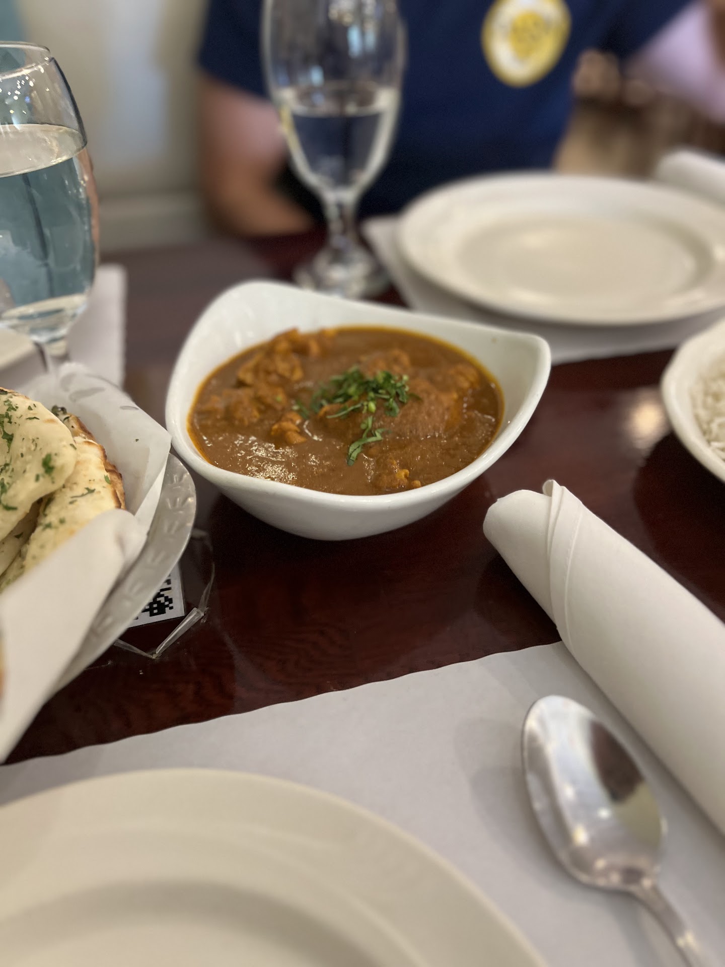 for 3 people, we ordered butter chicken and vindaloo (chicken option), both on a medium-hot spice level, along with two garlic naans