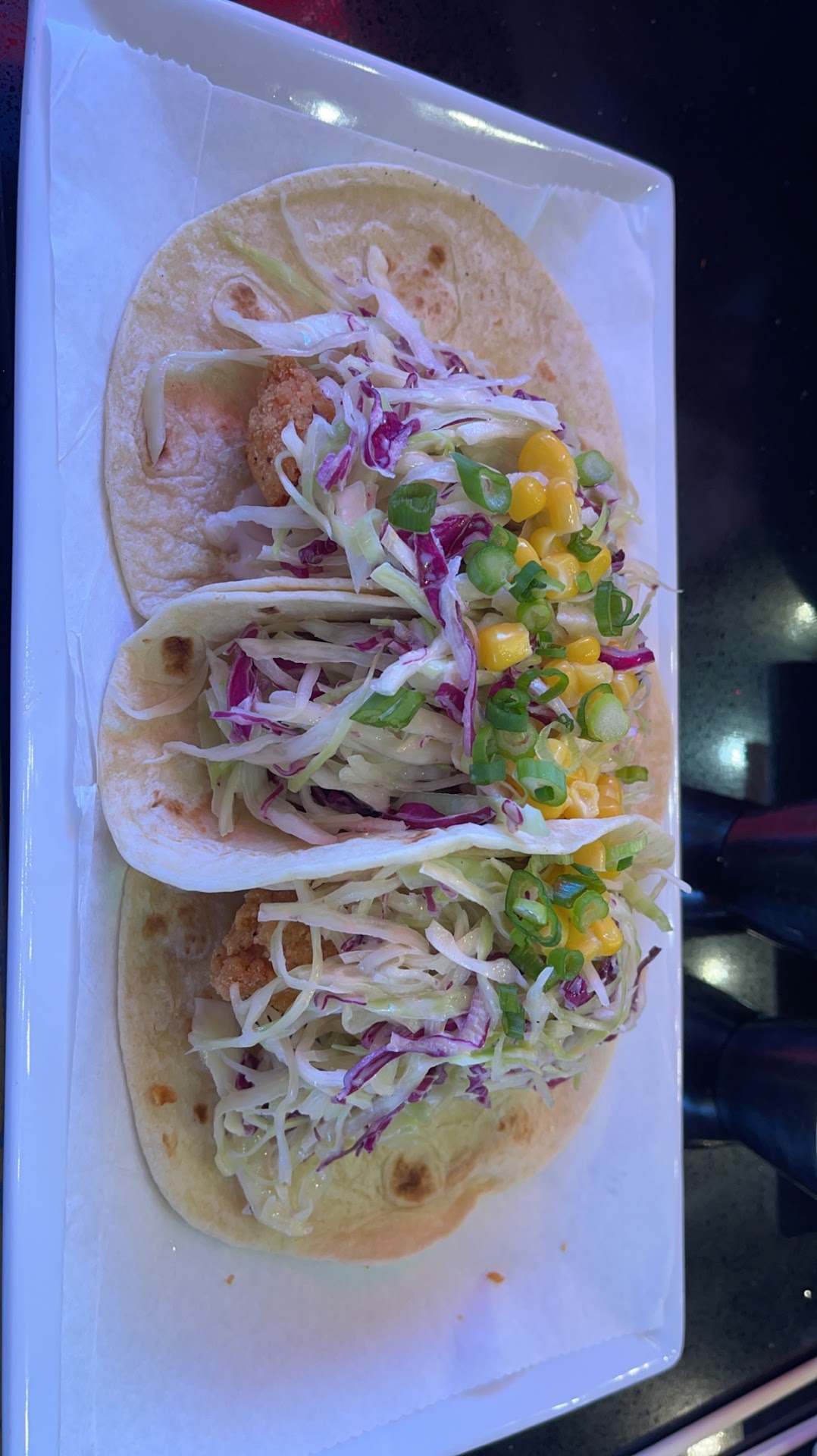The shrimp tacos were pretty good, but shrimp was absolutely the freezer kind you thaw, not fresh. Was very bland and has that bad after taste of a frozen cooked shrimp. The corn and cabbage were fresh, and sauce very good.