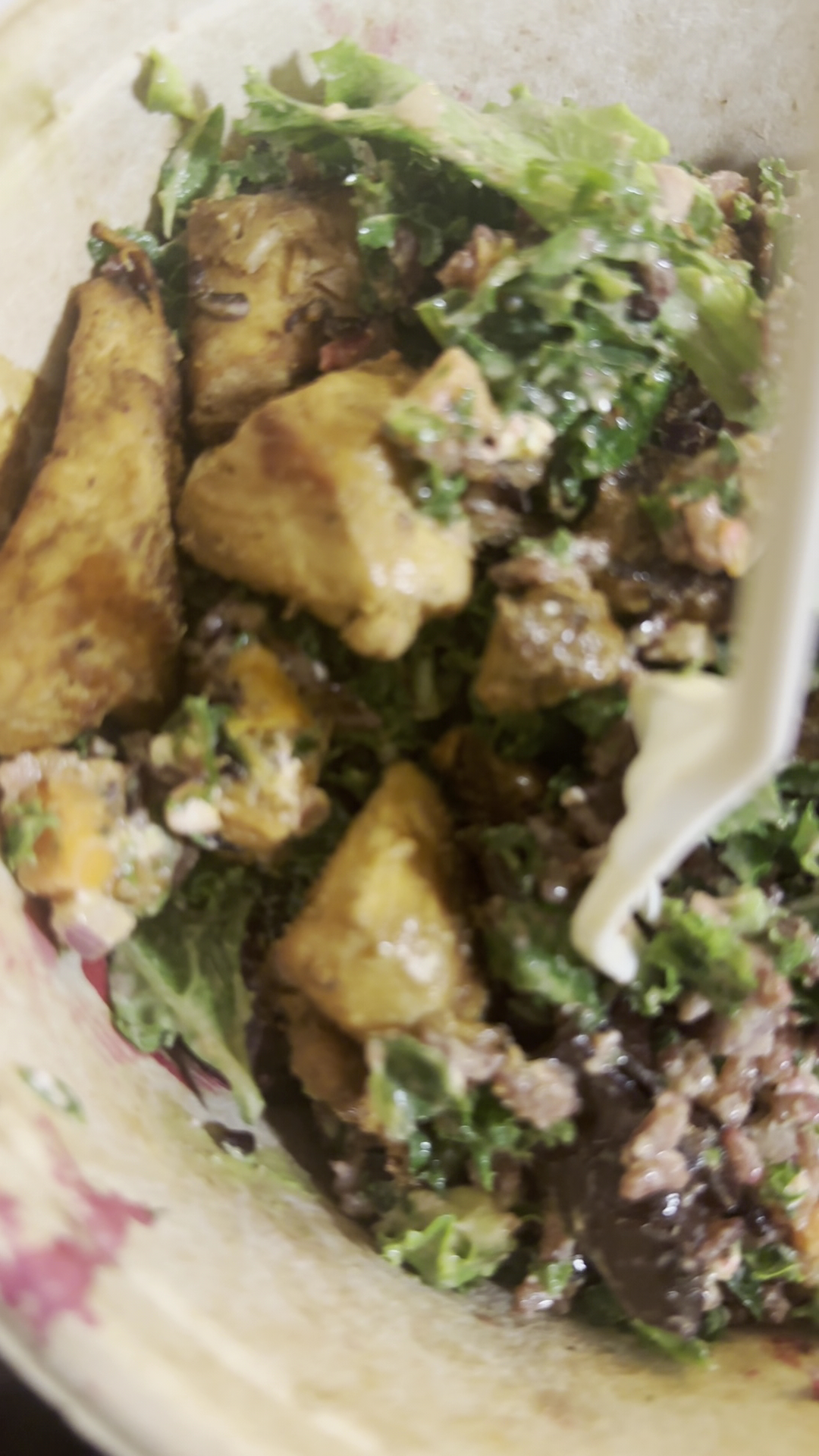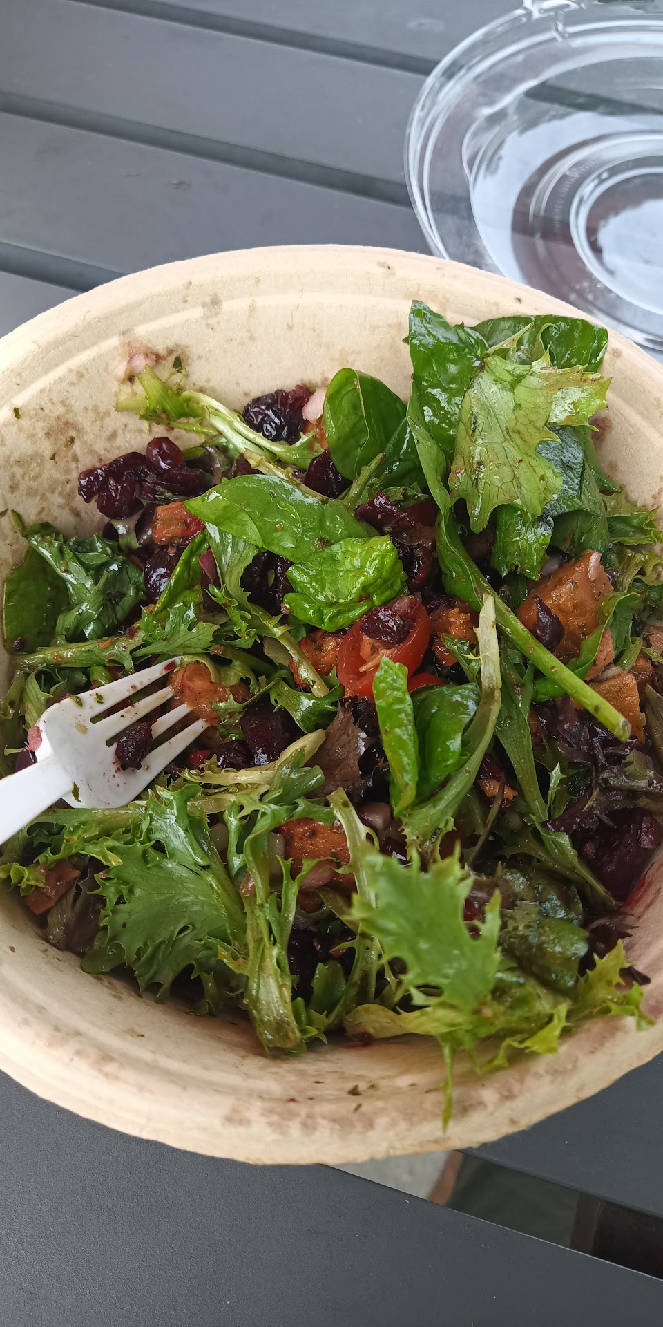 I was surprised and disappointed when I took my first bite and the anticipated freshness of leaves and cilantro lime dressing and the comfort of roasted sweet potatoes and beets were downright demolished by the strong arming flavor of cinnamon sugar. The best I can say about what I got is that I was hungry enough to finish it. My wife liked hers better until she found something in one of her bites that felt like plastic (Picture 2). She emphatically declared "we're not returning," to which my body responded with a wave of relief.