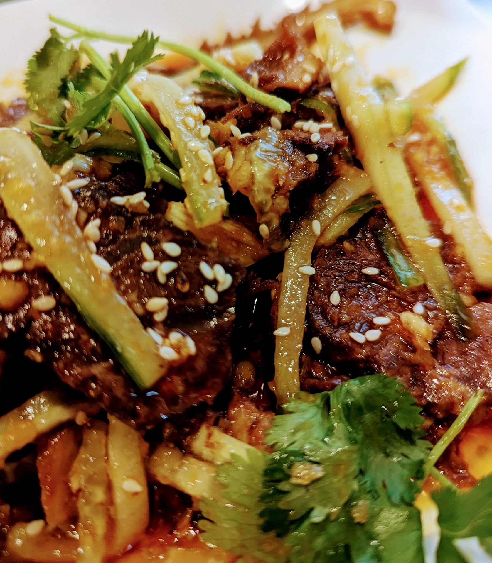 The dry pot beef includes onions, green and red peppers, dried peppers, garlic, tofu skins, seaweed, mushrooms, zucchini, lots of chili flakes/chili oil, and parsley. Has the delicious flavor of chili and five spice, and not overly salted. Overall, so good and much more authentic than the run of the mill general tso's or orange chicken that is just sugary chicken. The menu seems to have a lot of choices to make everyone happy, and does have the Americanized chinese staples like General Tso's and sesame chicken for those who may be a bit less adventurous.