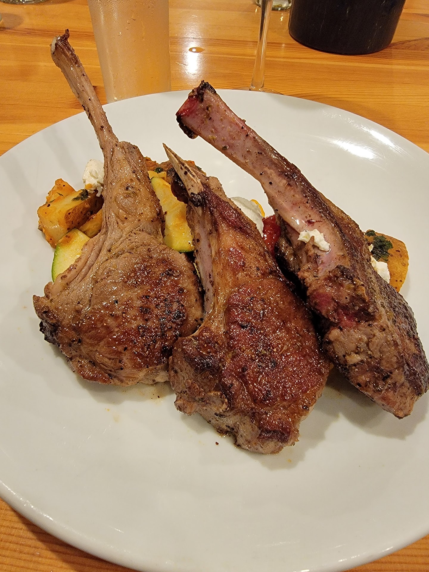 My lamb "chops" (misleading, given that you are served a single t-bone chop) was adequately seasoned and correctly prepared to temperature, but was maybe half an inch thick. Puny, given the $35 price tag. Seven to ten bites and suddenly you're circling the edges of the bare bones, hoping that you somehow missed a spot. They skimped big time on the mint chimichurri, too, treating it more like a perfunctory parsley garnish rather than a complement to the lamb. It's lamb! Make with the mint!