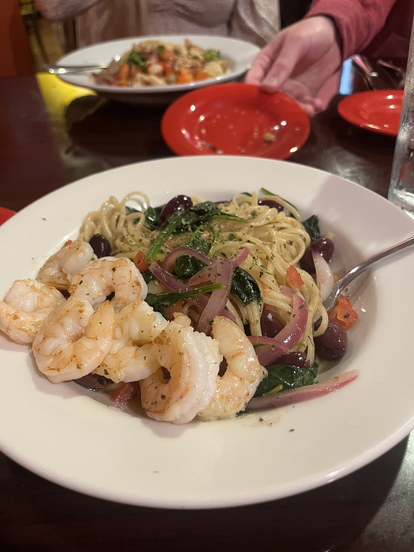 I had a dish called Greek Shrimp, which was sautéed shrimp with feta, spinach, tomatoes, onion and olives. It was clearly a pan sauce finished to order, and it was served over their home-made linguine. Very tasty, not overwhelmed by the toppings, and the sauce was light and yummy. The pasta was a perfect al dente.