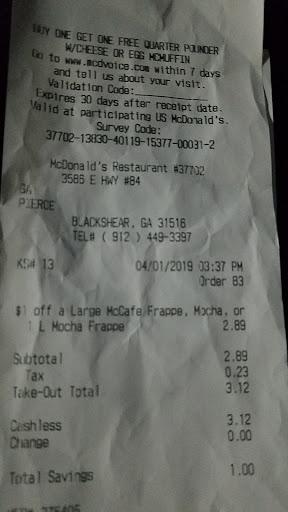 Read moreI truly believe our McDonald's, here in Blackshear, Ga, has the best quarter pounder w/cheese burger out of ALL/ANY OTHER McDonald's there is! Lol I mean, it's just always so0o0 good! Made perfect to my specifications!