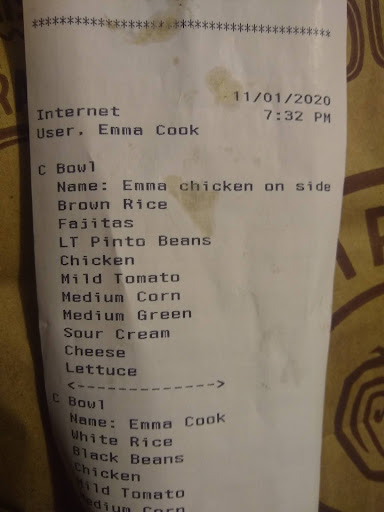 Read moreIn the past, this Chipotle has been just fine, no issues or complaints. However, tonight I decided to order online from this location because it would be convenient to pick up some groceries. I called ahead to ask Chipotle if they could put the chicken on the side of my bowl, the gal I spoke to on the phone said they could do this for me. As long as I put in the "notes" (which there is no section for when placing online orders) or by my name. She also asked for my name on my order ahead of time to tell them to put the chicken on the side. I placed my order online and put in the name "Emma chicken on side" . When I got home with my order, the chicken was NOT on the side. You can see my picture for proof that I asked for it on the side. I paid for the chicken bowl, but simply wanted the chicken on the side so my dog could have some as a treat. I don't understand why the employee on the phone told me she would accommodate this but did not. Very unsatisfactory. Also, since I am still paying $7 for a chicken bowl, why does it matter if I want the meat on the side?!?! You guys put guacamole and cheese, sour cream on the side, why not the meat!?? I continued to eat my meal which was the WORST Chipotle I ever had, everything was soggy and cold. To me, this was just laziness of the employees to not read the customer notes. I will NOT be going back...