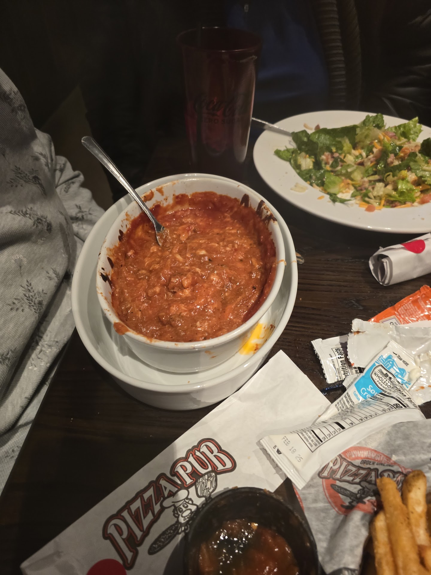 Read moreThe only reason why I'd give this place even a 1 star review is because our server, Dustin tried his best. And for how busy it was he did good work. On the other hand the place currently is a failure, we showed up at 330 pm and waited twice as long as most because we had a group of 5 people. We got seated at 4:30. We were seated in a small table for 4 people and an extra chair at the end. Right by the game room. (Some kid playing hit my mom with a knife in the back) it was a butter knife and not done on purpose, but why was a kid allowed to run around with a knife especially a kids area, and no supervision from staff as far as I can tell. We sat there for 15 minutes before our server arrived, we ordered water, pop nachos and 1 beer. The sodas came quickly. The beer came after the appetizer arrived. Like 20 minutes after everyone else. Our drinks ran empty and not filled until after Dustin came to take our order. He replenished our drinks and tried his best to get the beer to us in under 10 minutes. Now we wait, 30 minutes later, a salad came, then 30 minutes after that another side salad came. Then 25 minutes after that the food arrived, everyone was happy with the salads, the taco wrap was awful, over cooked meat, and came with a tube of sour cream and hienz taco sauce?(really for 15 dollars? Also the fries that came with it were good at first, until I realized that it was cross contaminated with other ingredients, vinegar. dill, not sure what it was. But it was not threw out the fries but on portions. The lasagna was more of a soup, and the spagetti(that the server did refund only the meatballs) obviously they forgot the meatballs. It was really frustrating to watch every table around us get served, leaving and the next group get there food before we did.(granted they ordered pizzas) We spent 120 dollars, and it took 2.5 hours to get all of our food. If this is going on, in the bottom floor I could only imagine what is happening to those 150 dollar stakes upstairs as well as those fancy appetizers us people on the bottom floor I not...